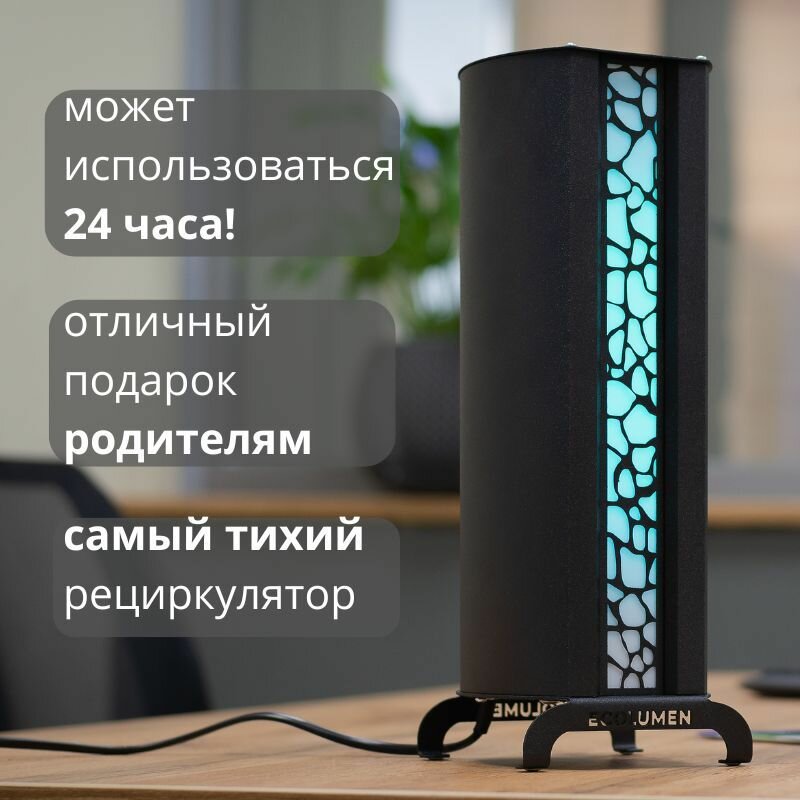 Самый тихий рециркулятор, имеет функцию подсветки, может применяться как ночник в спальне или детской. Уровень шума компьютера находится в пределах от 35 до 50 дБ, уровень шума УФС2 Design составляет 23-24 дБ. Безопасен для людей и животных. Облучатель кварцевый уничтожает 99,9% вирусов, коронавирусной инфекции (КВ19) и особенно необходим в период вирусных эпидемий, передающихся воздушно-капельным путем. Лампа для кварцевания помещений УФС2- отличный подарок родным и близким! Рекомендован Роспотребнадзором для профилактики ковид.