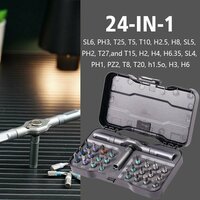 | Дополнительная информация | оснастка в комплекте: рукоять для бит, биты, Кейс (сумка) в комплекте, Количество бит 24 шт. Шлицы бит крестообразный (PH), крестообразный (PZ), прямой (SL), шестигранный (H/HEX), Torx (T/TX) Биты подробно PH1, PH2, PH3, SL4, SL5, SL6, PZ2, T5, T6, T8, T10, T15, T20, T25, T27, H1.5, H2, H2.5, H3, H4, H5, H6, H6.35, H8 |
