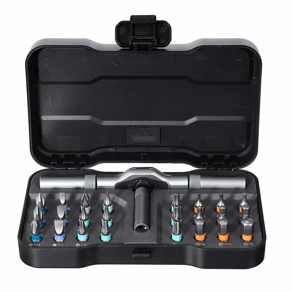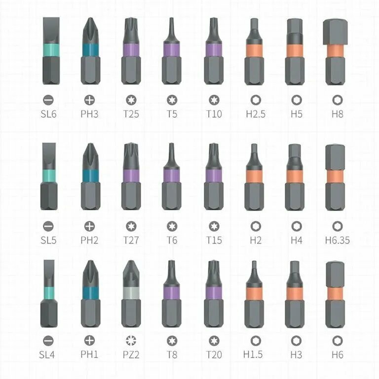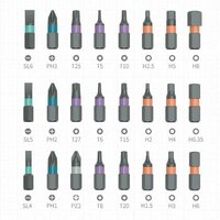 | Дополнительная информация | оснастка в комплекте: рукоять для бит, биты, Кейс (сумка) в комплекте, Количество бит 24 шт. Шлицы бит крестообразный (PH), крестообразный (PZ), прямой (SL), шестигранный (H/HEX), Torx (T/TX) Биты подробно PH1, PH2, PH3, SL4, SL5, SL6, PZ2, T5, T6, T8, T10, T15, T20, T25, T27, H1.5, H2, H2.5, H3, H4, H5, H6, H6.35, H8 |