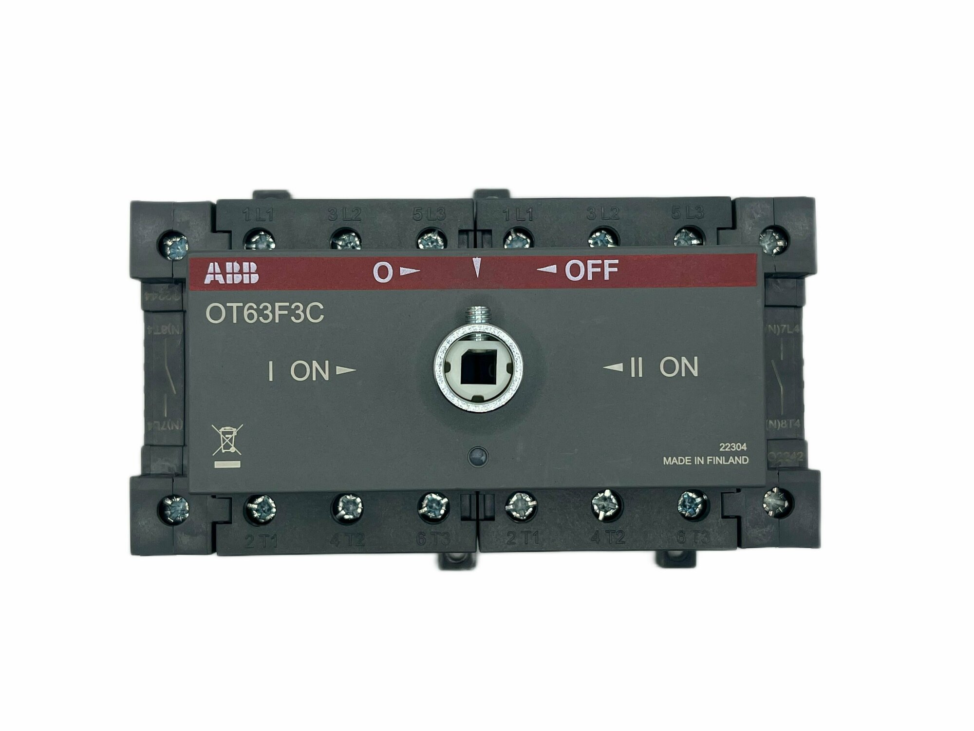 Рубильник реверсивный ABB трёхфазный с доп. полюсами OT63F3C 63А с красной ручкой