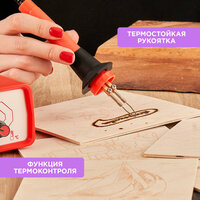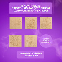 Выжигание по дереву станет любимым занятием как для ребенка, так и для взрослого. Набор изготовлен из качественной шлифованной фанеры и относится к эко-игрушкам. Обладает всеми сопутствующими достоинствами: естественный цвет и запах положительно влияют на психику; фактура, текстура и плотность дерева передают тактильные ощущения и играют важную роль в познании мира, дают ребенку реальные представления о вещах и материалах. На доски нанесены рисунки с различным уровнем сложности: тигр, самолет, машина, корабль-парусник, космос. Серия рисунков больше подойдет мальчикам. Прибор для выжигания мощностью 40 Вт с эргономичной рукояткой из термостойкого пластика исключает возможность случайных ожогов. Есть возможность регулировки температуры нагрева в диапазоне от 450 до 750 градусов. Оформить готовую работу можно акварельными и гуашевыми красками, цветными карандашами и фломастерами. Размеры доски - 15х15 см. Толщина: 4 мм. В комплекте поставляются 5 досок и прибор.
