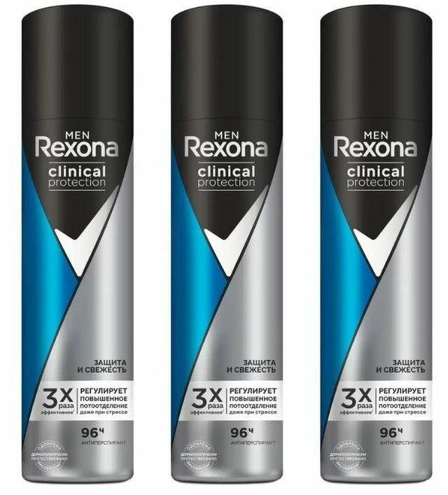 Доверьте длительную и надежную защиту от пота и запаха бескомпромиссной новинке от Rexona Clinical Protection – гипоаллергенному антиперспиранту-аэрозолю. Он эффективен до 96 часов. Не содержит отдушек, подходит для мужчин и женщин с чувствительной кожей. Клинически подтверждено. Clinical protection – защита от повышенного потоотделения. В комплекте- 3 штуки.