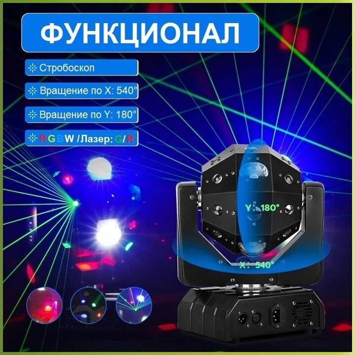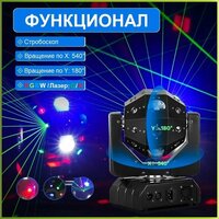 REXUS MH-229 "Variety" - светодиодная голова вращения "4 эффекта в одном приборе", лазерные лучи, стробоскоп, лучи BEAM, DMX, автоматическое вращение, звуковое управление, бесконечное вращение.
