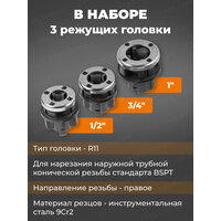 В набор входят три режущих головки с наиболее встречаемыми размерами - 1/2, 3/4 и 1 дюйм, трещотка, увеличивающая эффективность и удобство работы. Поставляется в эргономичном пластиковом кейсе.