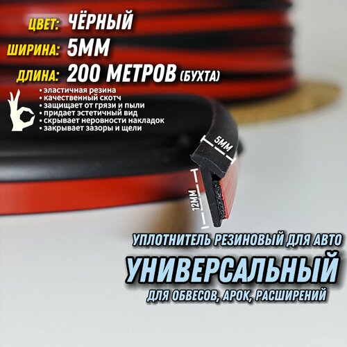 Резинка для обвесов черный/5мм/200 метров бухта со скотчем. Уплотнительный молдинг для кузова, арок, расширений, накладок, порогов, бамперов губы фендеров тюнинга.