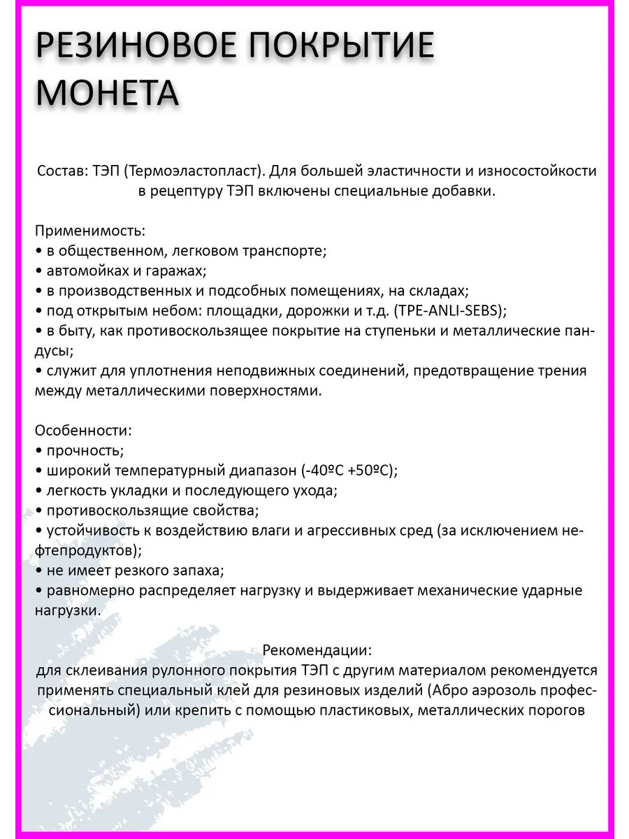 Резиновое покрытие Монета в Голубом цвете станет отличным решением для создания безопасной и стильной поверхности. Это бесшовное покрытие идеально подходит для использования в помещениях и на открытых пространствах. Его устойчивость к механическим повреждениям и воздействию влаги делает его отличным выбором для детских площадок, спортивных объектов, тренажерных залов а также гаража и на других поверхностях. Этот материал обладает хорошими амортизирующими свойствами, что минимизирует риск травм при падении. С его помощью можно создать комфортное пространство для занятий спортом или активного отдыха на свежем воздухе. Кроме того, покрытие имеет высокий уровень износостойкости, что гарантирует долгий срок службы даже при интенсивной эксплуатации. Состав: ТЭП (Термоэластопласт). Для большей эластичности и износостойкости в рецептуру ТЭП включены специальные добавки. Особенности: • прочность; • широкий температурный диапазон (-40ºС +50ºС); • легкость укладки и последующего ухода; • противоскользящие свойства; • устойчивость к воздействию влаги и агрессивных сред (за исключением нефтепродуктов); • не имеет резкого запаха; • равномерно распределяет нагрузку и выдерживает механические ударные нагрузки.