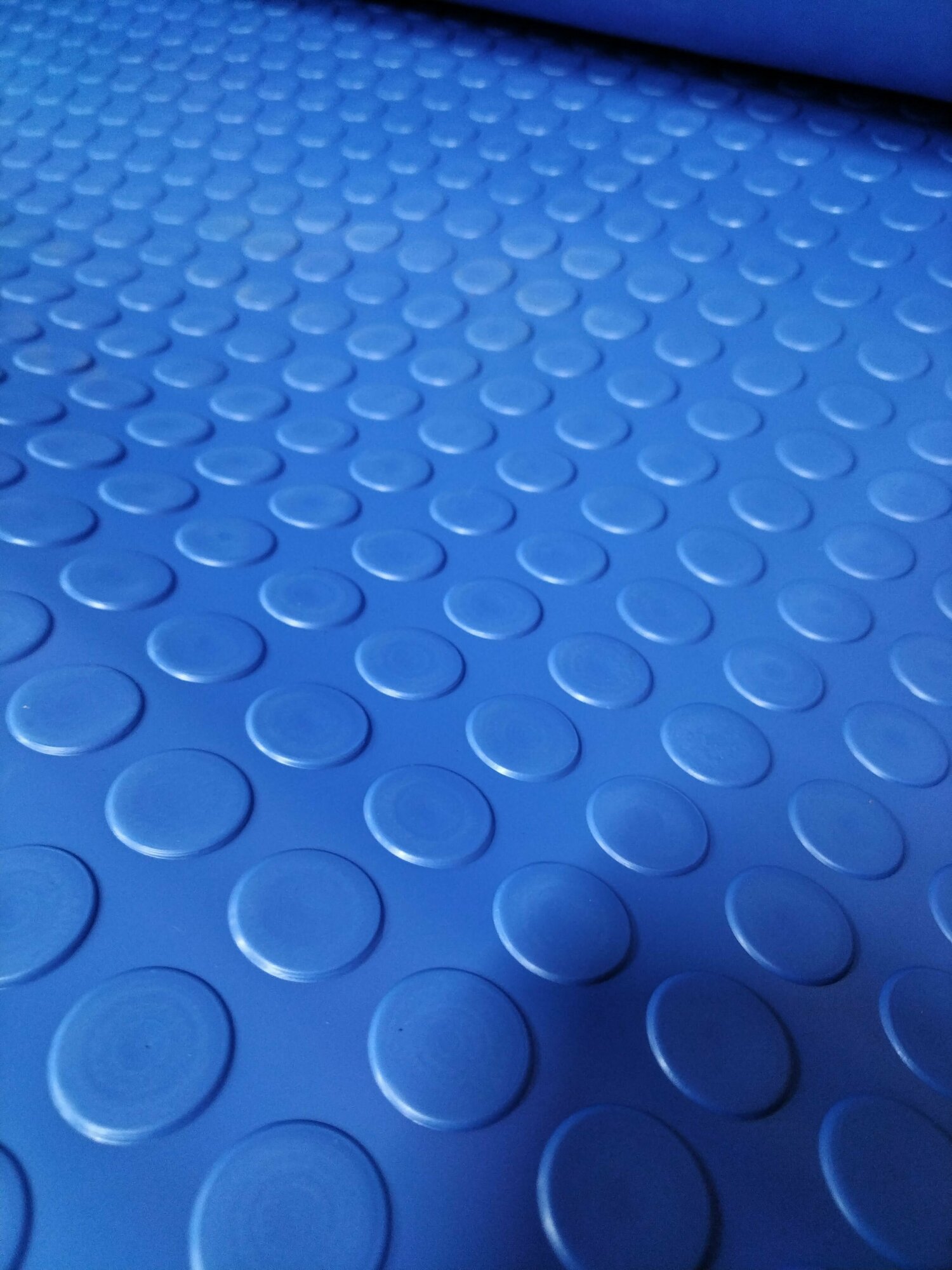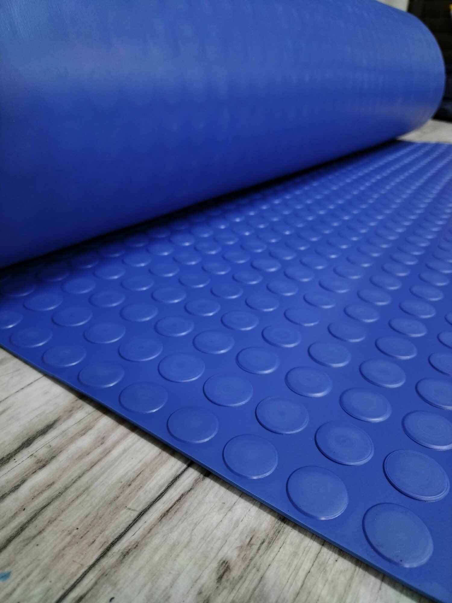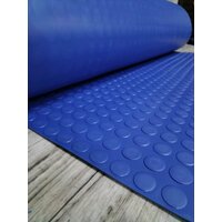 Резиновое покрытие 1.2 на 3.5 «Монетка» Цвет синий. Общая толщина с выступом — 3 мм. представляет собой рулонную дорожку прямоугольной формы с рифленой поверхностью в виде кружков, которая обладает высокими противоскользящими качествами. Изделие изготовлено из вулканизированной резины и относится к категории водонепроницаемых покрытий. Условия эксплуатации – в жилых помещениях не применяется.