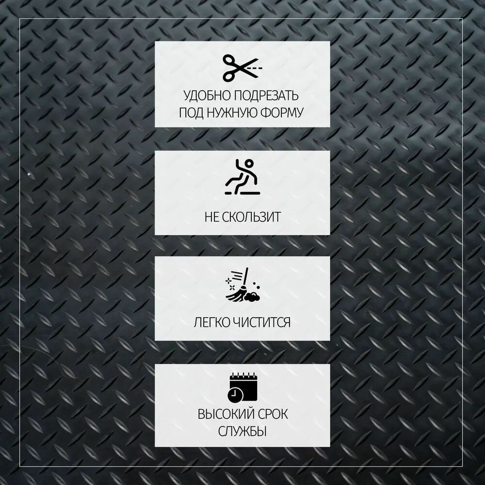 | Дополнительная информация | Резиновая дорожка обладает анти-скользящими свойствами, благодаря мелко-рифленой поверхности. Материал 100% резина (не ПВХ!) защищает от механических повреждений, а также способствует комфортному и уверенному хождению. |