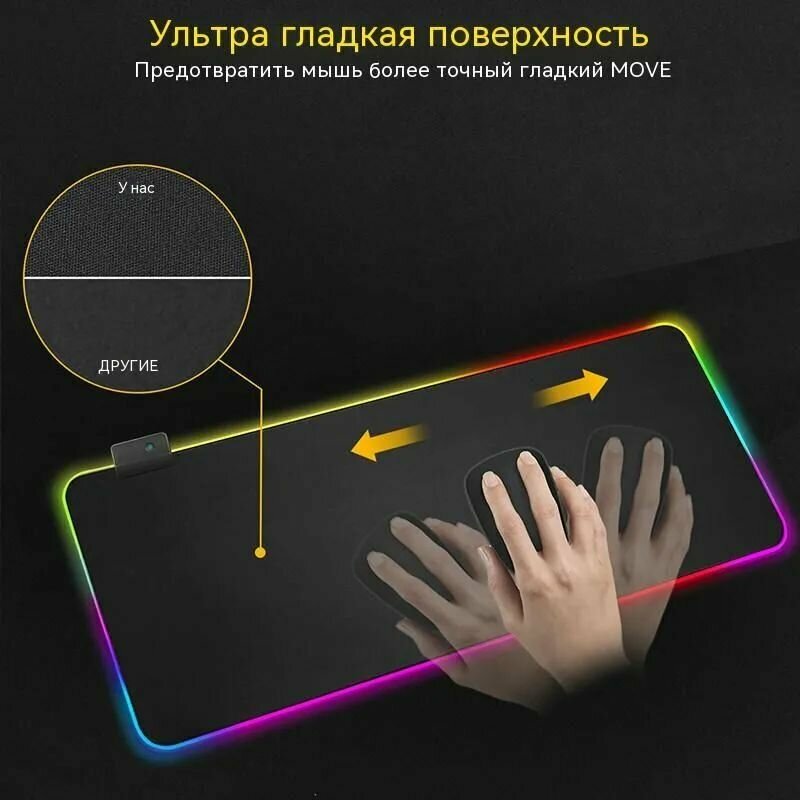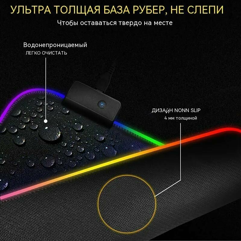 Игровой коврик для мыши RGB 40*90*0.3 c подсветкой и противоскользящее покрытие, обеспечивает точное управлению мыши и устойчивость во время игры, сверхтонкий коврик для мыши оптимизирован для всех видов чувствительности мыши; мышка легка в управлении Нижняя часть игрового коврика для мыши выполнена из натурального каучука, что обеспечивает надежную фиксацию к поверхности стола. Края RGB-коврика прошиты, что делает изделие более долговечным; Коврик с подсветкой для мыши и клавиатуры оснащен RGB с usb подключением, прост в установки, подключи и играй Коврик подойдет к любому рабочему и игровому столу и впишется в любой интерьер и даже украсит своими светодиодными салютами, состоящий из 14 режимов подсветки; Гладкая поверхность и не скользящая каучуковая основа устойчива к различным загрязнениям, проста в уходе и надежно фиксируется на любой поверхности, также игровой коврик изготовлен из водонепроницаемого и водоотталкивающего материала, что позволяет легко протереть с поверхности пролитую воду/ча/кофе/сок Купи большой коврик для мыши и клавиатуры с подсветкой и окунись в игровой мир с удовольствием