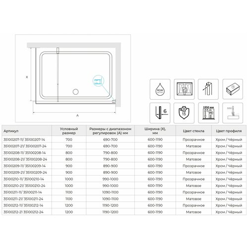 Страна производитель: Россия / ГерманияГарантия: 3 годаСерия: Walk InВысота общая: 1950ммТолщина стекла: 6ммУсловный размер: 800ммЦвет стекла: Матовое-СатинатРазмеры с диапазоном регулировок: 790-805Цвет профиля: ЧерныйМатериал профиля: Анодированный алюминийКласс защиты герметичности: 3 класс герметичностиКонструкция дверей: НеподвижнаяПокрытие стекла анти капля: Easy CleanРегулируемый профиль: даУниверсальная установка: даКоробок в упаковке: 1штРесурс эксплуатации: 15 летКомплектация: