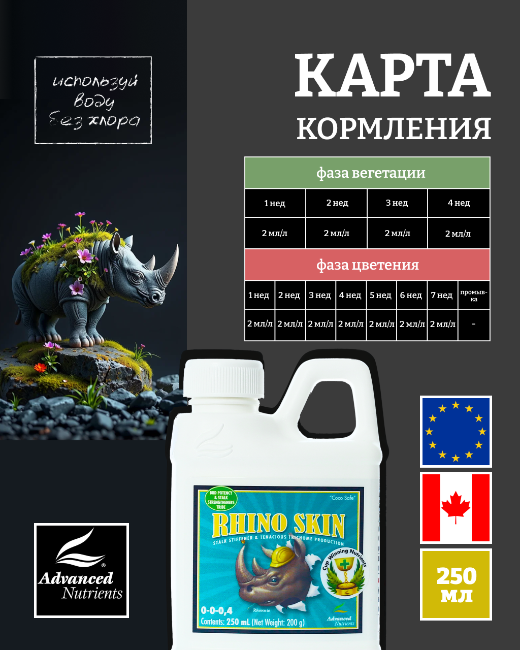 Advanced Nutrietns Rhino Skin Rhino Skin – это особый кремниевый состав, разработанный так, что его легко смешивать с водой, и он легко впитывается растениями. Кремний укрепляет клеточные стенки, стебли и листья. Rhino Skin является продуктом из линейки pH Perfect, а используя эту линейку, вы можете забыть о необходимости следить за кислотно-щелочным балансом!