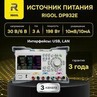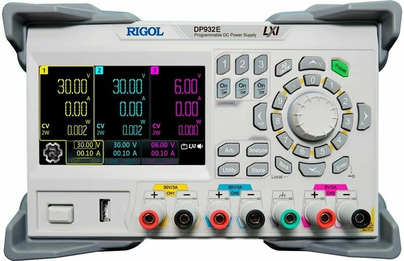 3-канальный источник питания постоянного тока Rigol DP932E оборудован встроенными средствами для контроля выходных характеристик, показатели которых, для наглядности, могут отображаться на экране одновременно. Включение-выключение каналов и настройка их параметров может производиться как по отдельности, так и одновременно. Наличие интерфейсов USB и LAN обеспечивает возможность дистанционного управления прибором с помощью подключаемого ПК. Опционально может быть повышено разрешение при установке и измерении силы тока и напряжения в 10 раз.