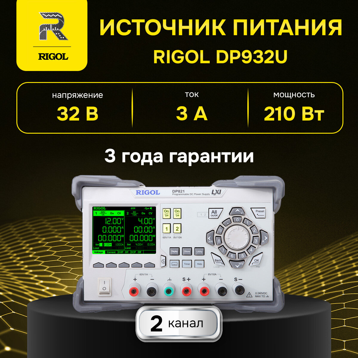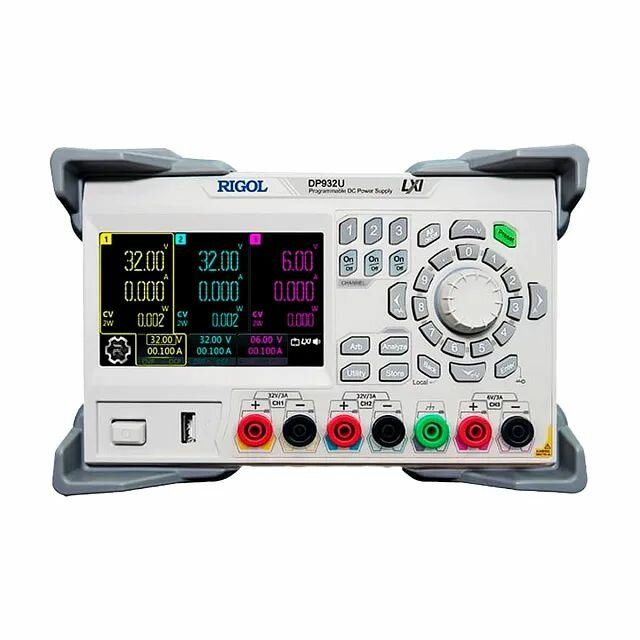 Программируемый линейный источник питания постоянного тока Rigol DP932U снабжен тремя независимыми каналами с регулируемым выходным напряжением 32 В/32 В/6 В суммарной мощностью до 210 Вт. Прибор обеспечивает высокую точность выходных параметров при низком уровне пульсаций и снабжен защитой от перенапряжения, перегрузки по току и перегрева, и может использоваться для различных лабораторных приложений.
