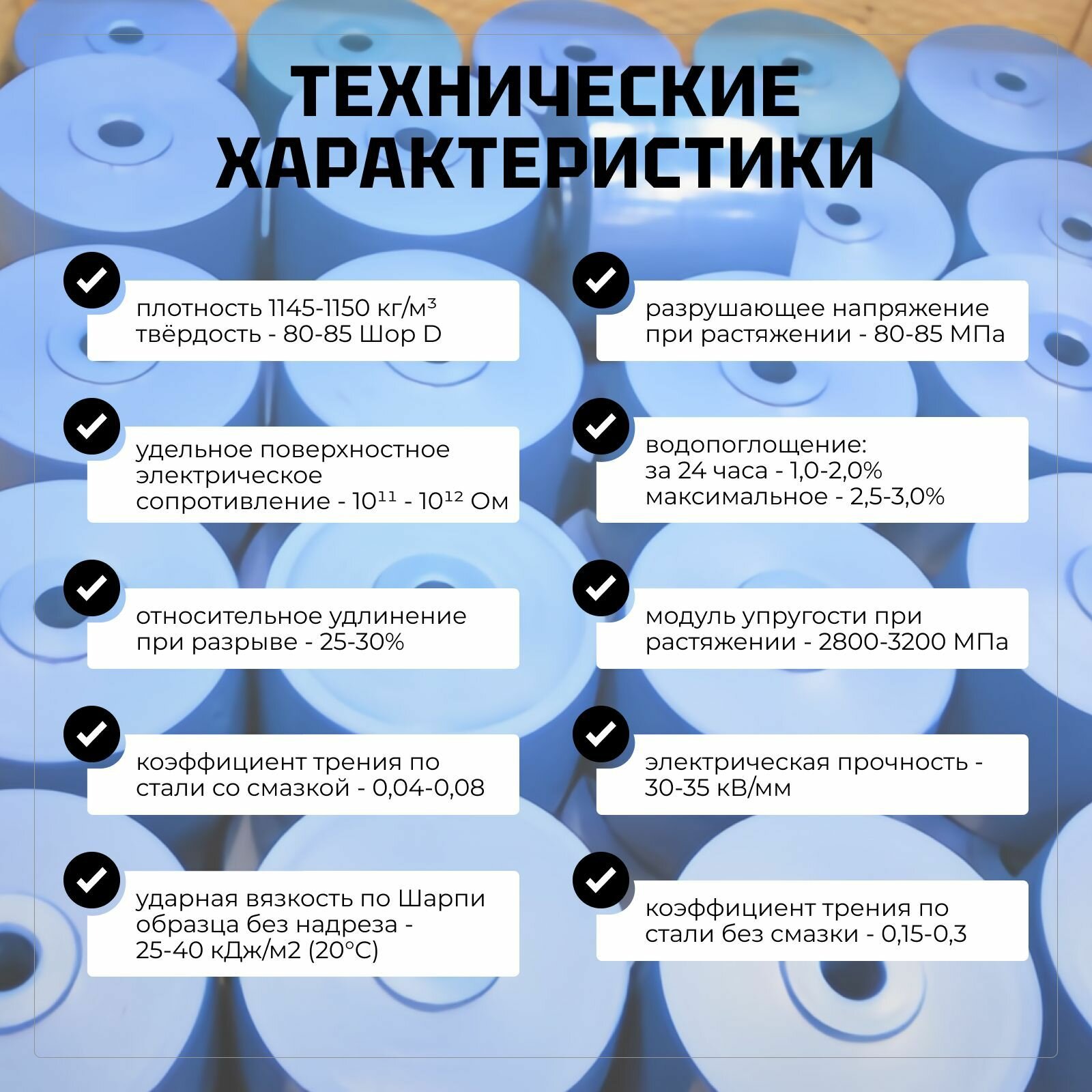 Высокая износостойкость материала (в 1,5 раза превосходит текстолит и в 10 раз – бронзу) и низкий коэффициент трения снижают уровень шума в узлах скольжения, а также дают возможность использовать детали в запылённых местах установки. Помимо этого, данный материал стоек к ударным динамическим нагрузкам, что позволяет сохранить работоспособность узла в критический момент.