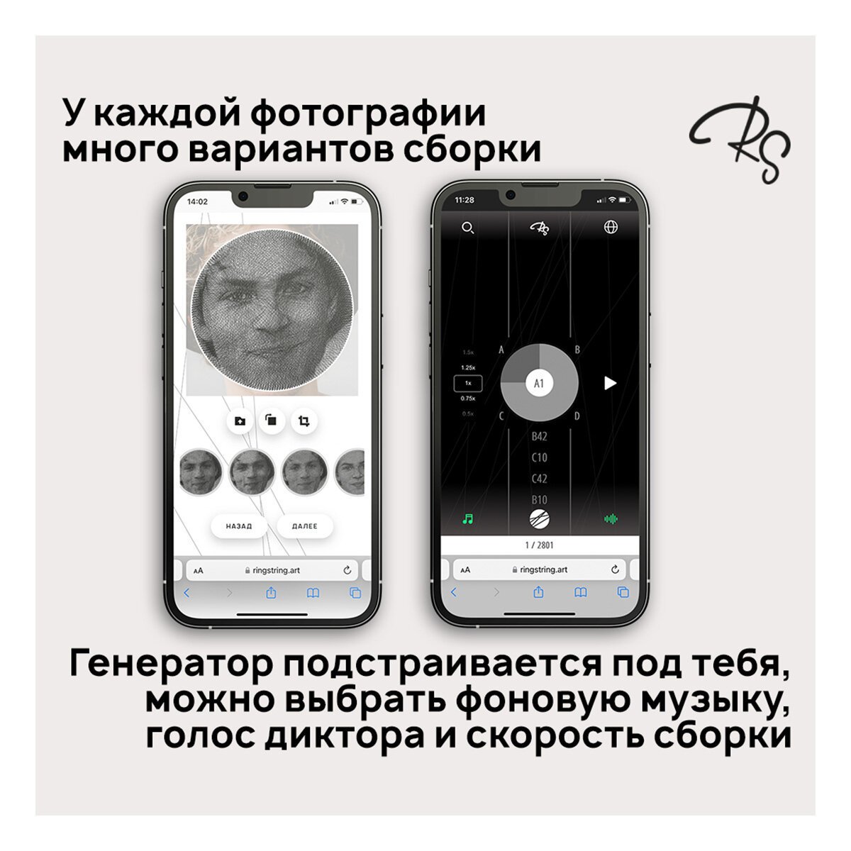 Всего 3 простых шага: 1 Покупаешь набор RingString; 2 Загружаешь фотографию на официальный сайт и получаешь инструкцию по сборке; 3 Собираешь портрет нитью с приятным голосовым сопровождением и медитативной музыкой.