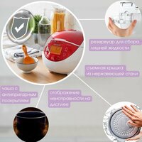 | особенности | антипригарное покрытие чаши, дисплей, регулировка времени приготовления, регулировка температуры, съемная верхняя крышка, чаша с ручками |