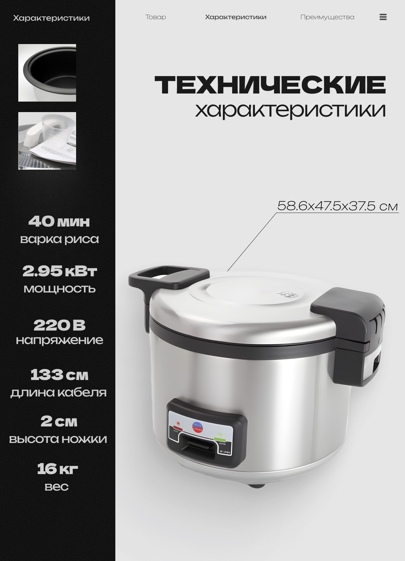 По окончании готовки рисоварка автоматически переходит в режим поддержания риса в разогретом состоянии; может хранить рис до 12 часов без потери вкусовых характеристик. Предусмотрен отвод водяного пара, и сбор конденсата в специальную емкость. Для более точного определения закладки риса в комплекте с рисоваркой идет мерная емкость.