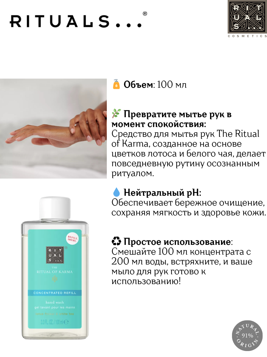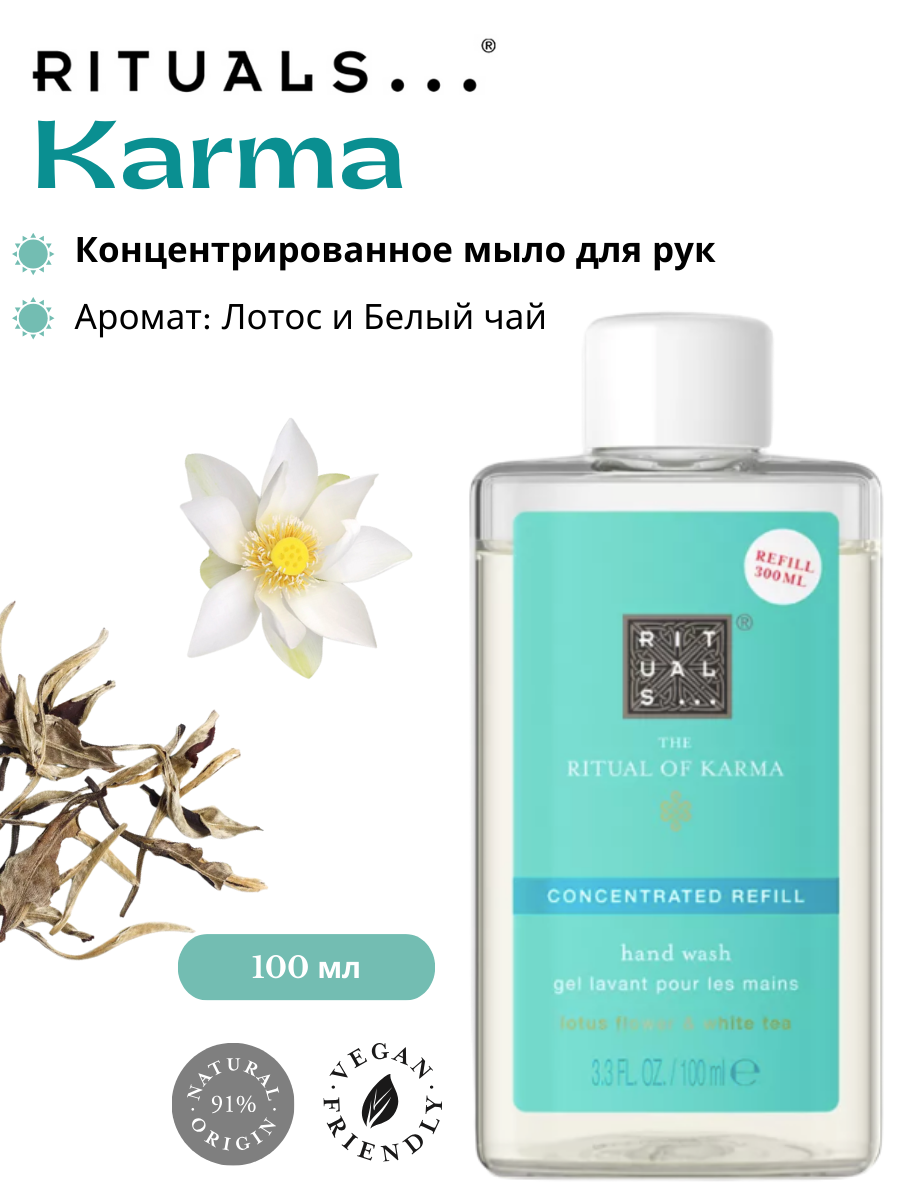 Rituals. Жидкое мыло для рук концентрированное (сменный наполнитель) «Karma» с ароматом священного лотоса и белого чая 100 мл: сравнение цен, характеристики, фото, актуальное наличие и цены.