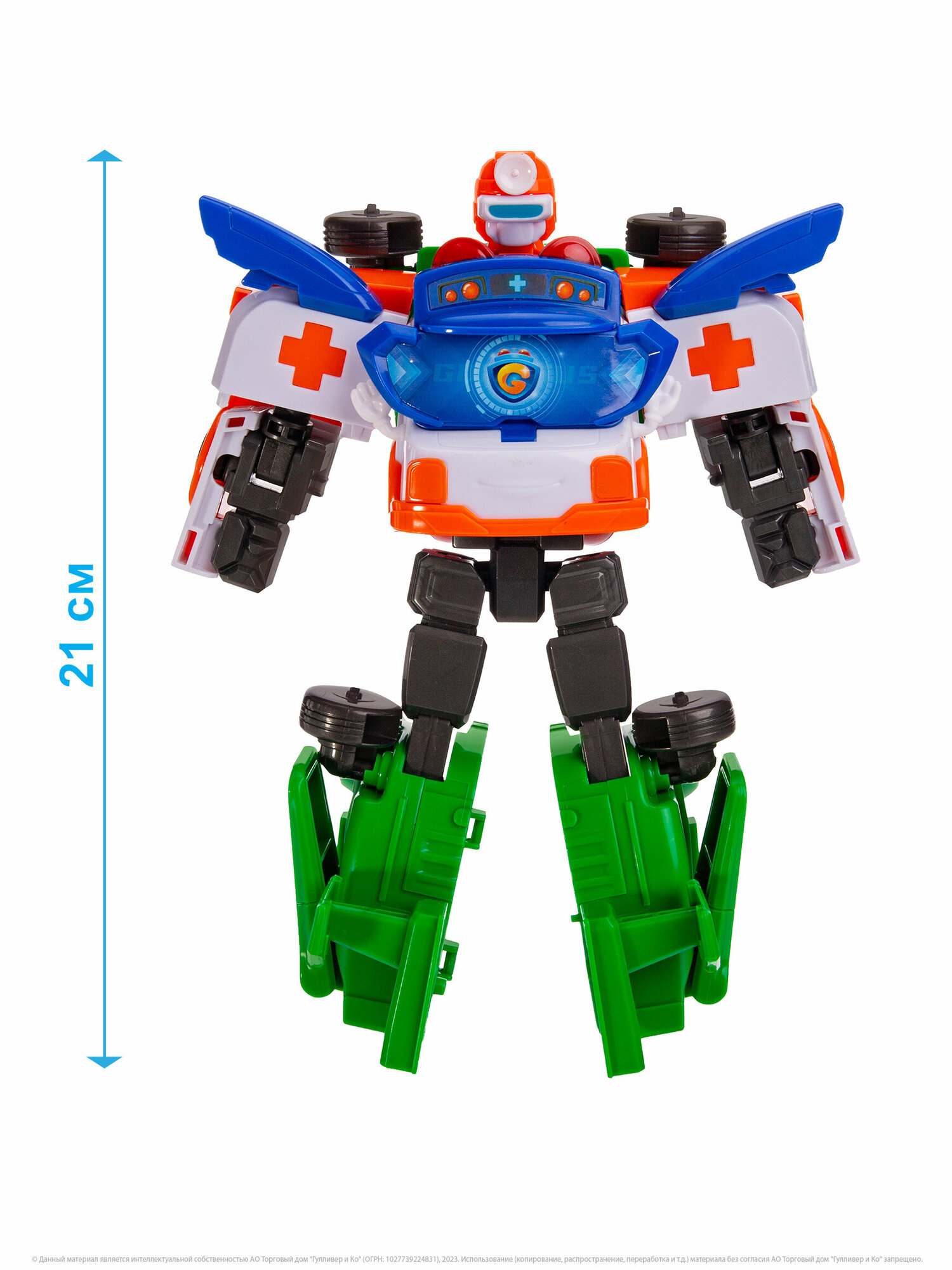 Актуальная игрушка робот-трансформер 2 в 1 позволяет превратить два транспортных средства в одного мощного робота высотой 21 см! За несколько манипуляций две машинки, скорая помощь и самолет, трансформируются в робота. По сюжету главный герой мультфильма, школьный автобус Гордон, умеет превращаться в такие транспортные средства как пожарная машина, корабль, скорая помощь, самолет или полицейская машина. Многофункциональность робота трансформера позволяет ребенку придумывать разные сценарии игры. Если собрать всех героев, то можно устраивать захватывающие погони в режиме полицейской машины, творить великие дела в роли пожарной машины, исследовать морские просторы в виде корабля, доставлять помощь в критических ситуациях как скорая помощь или покорять небо вместе с самолетом. Игрушка для мальчиков помогает им развивать воображение, креативность и творческое мышление. Робот игрушка выполнена из качественного пластика без посторонних запахов и острых углов, что делает ее безопасной для игры. Трансформер - это отличный выбор для развлечения и развития вашего ребенка. Такая развивающая игрушка станет прекрасным подарком для мальчика и даже девочки на Новый год, Рождество, День Рождения, 23 февраля или 8 марта. Позвольте им воплотить свои самые яркие фантазии и создать собственные приключения с этой удивительной игрушкой. Игрушка для мальчиков сертифицирована. Внимание! Не предназначено для детей младше 3-х лет!