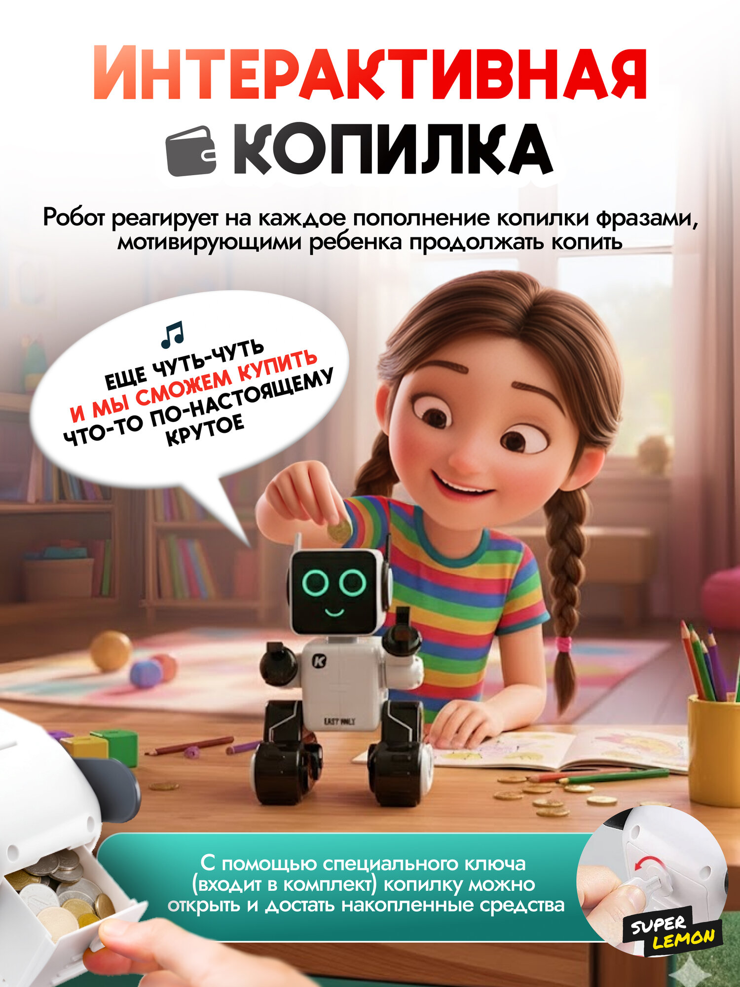 Интерактивный умный робот-доставщик с обучением финансовой грамотности от Super Lemon - это не просто игрушка, это обучающий инструмент, который поможет вашему ребенку развивать свои навыки и знания в области финансов.