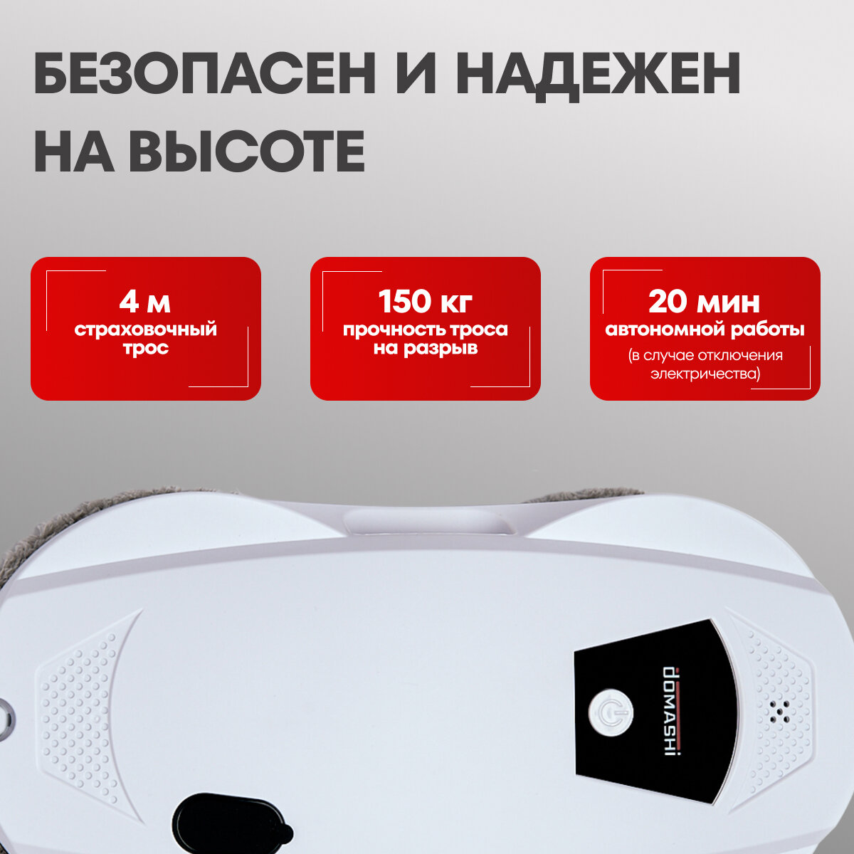 Корпус робота тонкий и легкий, что позволяет безопасно мыть окна даже с решетками. Благодаря этому Domashi Ley незаменим для коттеджей, таунхаусов и частного сектора. Он работает от сети и оснащен резервным аккумулятором для экстренных случаев.