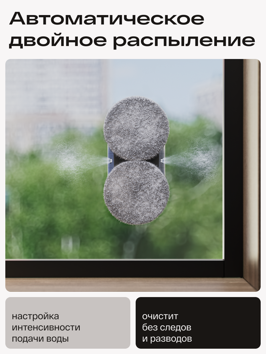 Робот-мойщик ATVEL Zorro Z6 Spray Plus с автоматическим двойным распылением воды обеспечивает идеальную чистоту поверхностей. Модель подходит для разных типов поверхностей: стёкол, зеркал, плитки, гладких стен и столов. Он смачивает стекло с частотой 5 раз в секунду, благодаря двум распылителям на корпусе. Это гарантирует эффективное удаление грязи и пятен без оставления разводов. Объём резервуара для воды составляет 50 мл, этого достаточно для уборки площади до 30 кв. м.