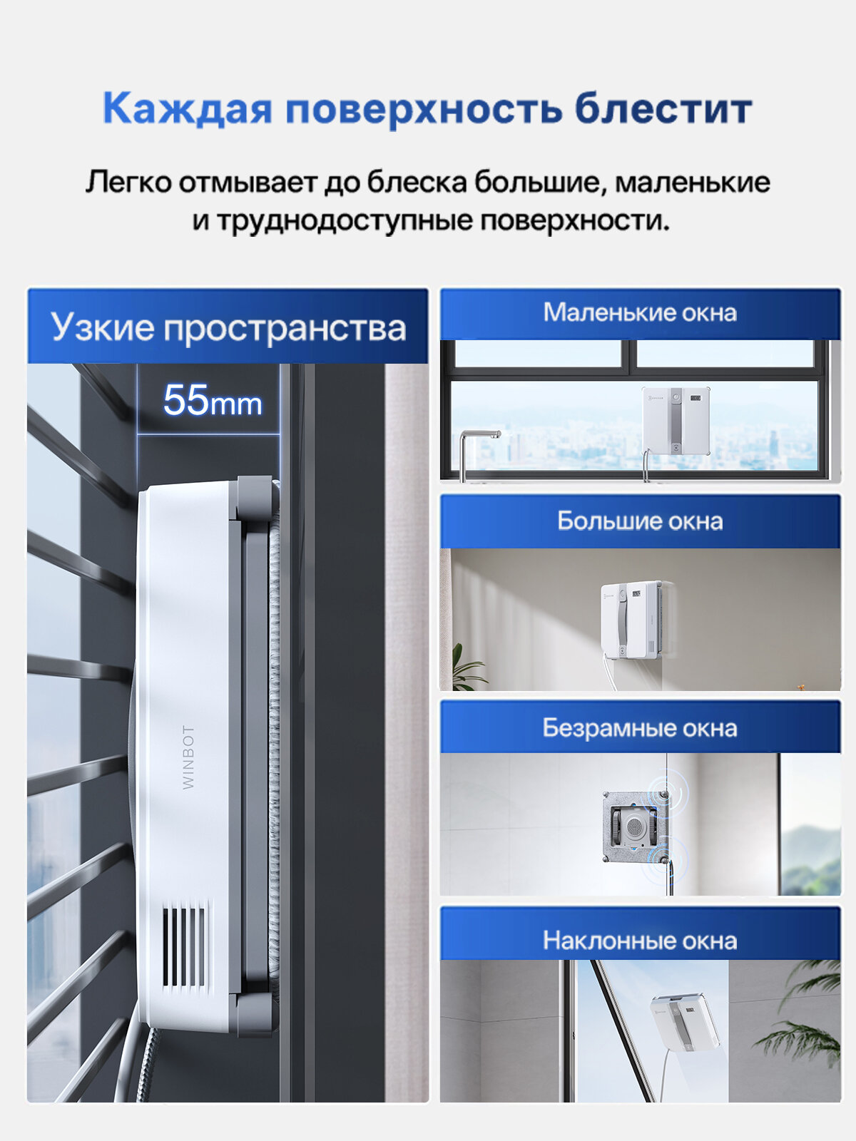 Тонкий и компактный дизайн позволяет роботу достигать областей, которые другие роботы-мойщики окон не могут. Теперь Winbot Mini может чистить небольшие окна с длиной одной стороны менее 30 см.