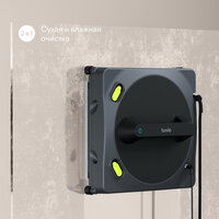 в комплекте также набор чистящих салфеток, флакон для воды/моющего средства; 2в1: сухая и влажная очистка, управление со смартфона, автоподача жидкости, авторежимы работы, подходит для любых гладких вертикальных покрытий; ёмкость для воды 30+30 мл