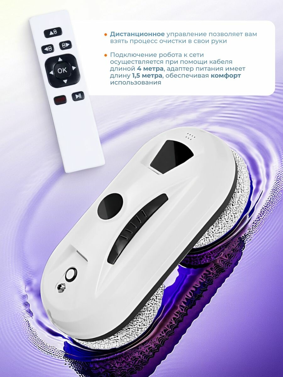 Xiaomi Home Window Cleaner (HCR-02) – робот для мытья окон, плитки и зеркал. Оснащенный мощным вакуумным двигателем с мощностью всасывания 2800 Па, он с двух сторон притягивается к поверхности стекла и безопасно перемещается по вертикальным поверхностям, оставляя за собой идеальную чистоту. Благодаря системе бесперебойного питания (СБП) вы никогда не столкнетесь с проблемой случайного падения устройства. Уникальные чистящие колеса с присосками обеспечивают отличное сцепление с поверхностью стекла и легкость движения робота. Искусственный интеллект способен определить траекторию движения, автоматически обнаруживать рамы и самостоятельно очищать всю площадь. Дистанционное управление позволяет вам взять процесс очистки в свои руки. Подключение робота к сети осуществляется при помощи кабеля длиной 4 метра, адаптер питания имеет длину 1,5 метра, обеспечивая комфорт использования.