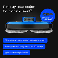 Система бесперебойного питания и встроенные датчики предотвращают падение робота. Даже при отсутствии питания электрический робот мойщик продержится на любой гладкой поверхности до 30 минут. Высокопрочный страховочный трос также повышает безопасность использования устройства.