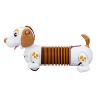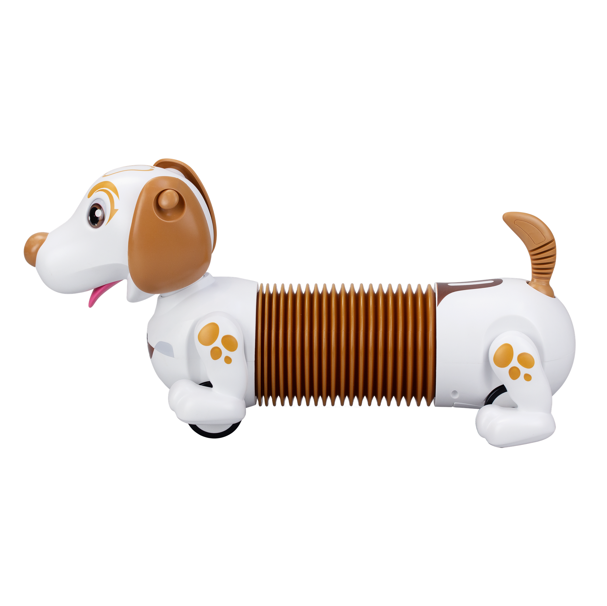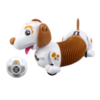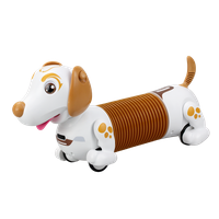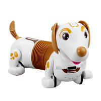 Чудесная собачка ДЭШ коричневого цвета управляются с помощью пульта и реагирует на жесты. Если провести рукой, собачка начнёт бегать по кругу за своим хвостиком. Она обходит препятствия и может последовать за тобой. Мяч является пультом управления движением питомца. Нажми на кнопку, чтобы задать команду своей собачке. Верный друг и милый питомец, который подаёт голос, как настоящая собака.