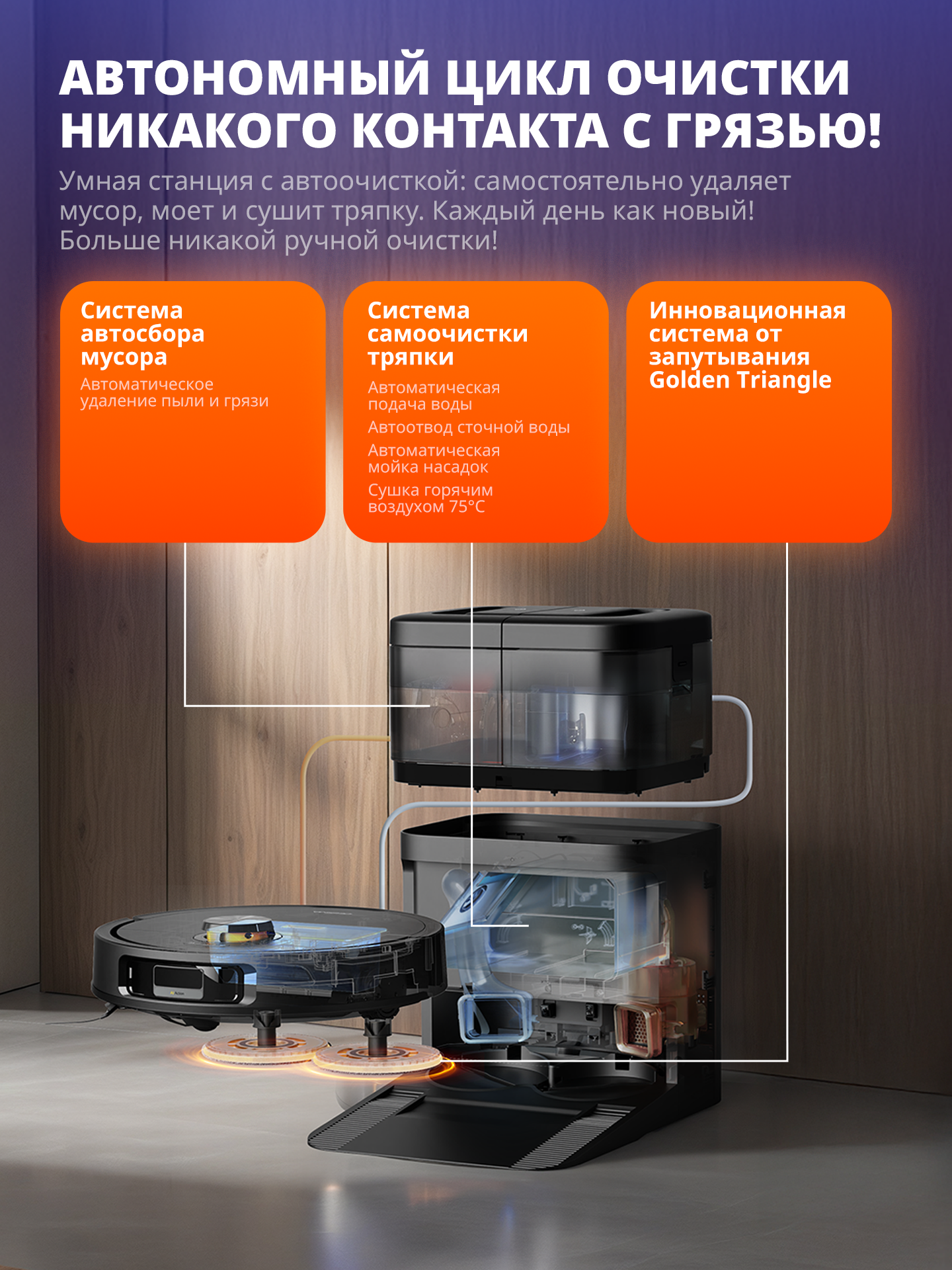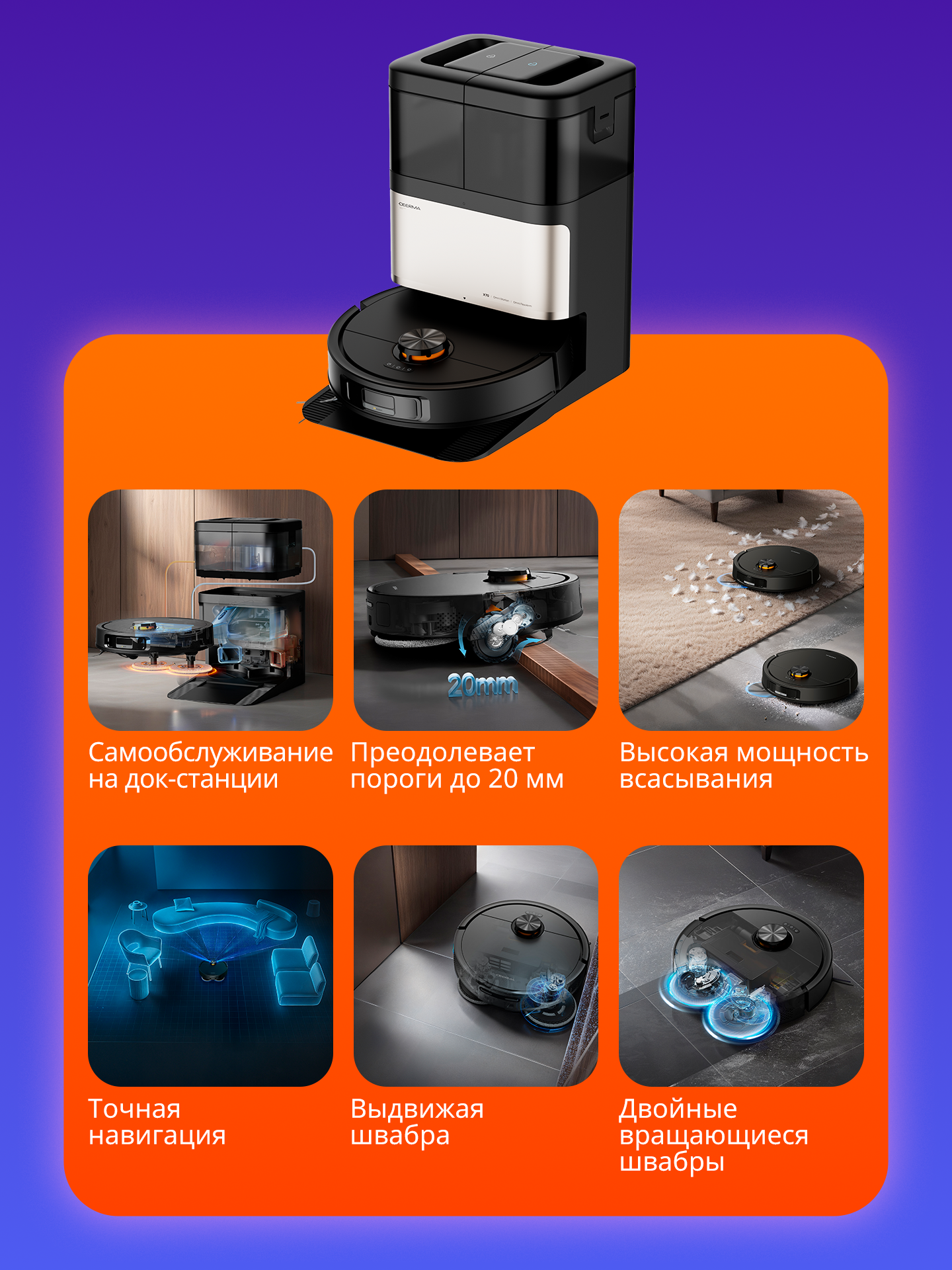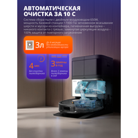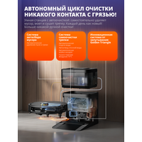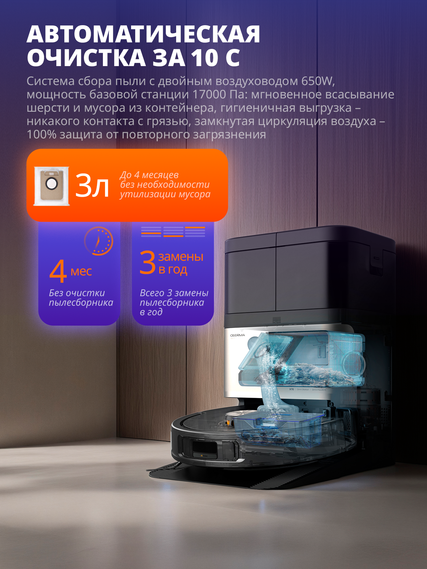 Автономность и удобство использования достигаются благодаря мощному аккумулятору 5200 мАч, обеспечивающему до 240 минут работы без подзарядки. Функционал Omni Station обеспечивает полное самообслуживание устройства, включая станцию автовыгрузки мусора. После каждой влажной уборки активируется функция сушки швабр при температуре 75C, уничтожающая микробы и неприятные запахи. Управление осуществляется через удобное мобильное приложение, а контейнер для пыли объемом 300 мл обеспечивает эффективную сухую уборку всего дома.