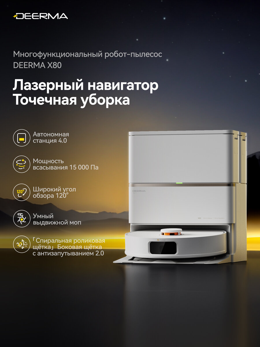 Deerma X80: Умный робот-пылесос, который работает за вас Устали от уборки? Deerma X80 — ваш личный помощник с ИИ. Он убирает умнее, тщательнее и полностью самостоятельно, возвращая вам свободное время. Ключевые преимущества, которые меняют всё: Полная автономность: Автоматическая база сама моет, сушит тряпки, сливает грязную воду и собирает мусор. Вы забываете об обслуживании на месяцы. Идеальная чистота у стен: Уникальные AI-бионические «щупальца» выдвигаются на 40 мм, очищая пространство в 1 мм от плинтуса. Никаких забытых углов! Безопасность и интеллект: 120° лазерный сканер «видит» помещение 15 раз в секунду, аккуратно объезжая провода, игрушки и даже спящих питомцев. Мощь и эффективность: Всасывание 15 000 Па за один проход справляется с крошками, песком и шерстью. Технология Anti-Tangle полностью исключает наматывание волос на щётку. Умный дом в вашем телефоне: Управляйте через Mi Home, голосом (Alexa/Google) или удалённо из любой точки мира. Робот сам поднимет тряпку над ковром и усилит всасывание. Гигиена и выносливость: Тряпки моются под давлением и сушатся при 85°C. Огромный 3L пылесборник и батарея на 240 минут (300 м²) избавляют от хлопот надолго. Deerma X80 — это свобода. Свобода от рутины для семей с детьми и питомцами, для занятых профессионалов и всех, кто ценит своё время. Выберите Deerma X80. Доверьте чистоту интеллекту.