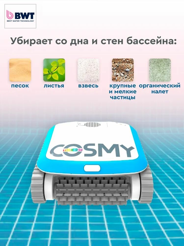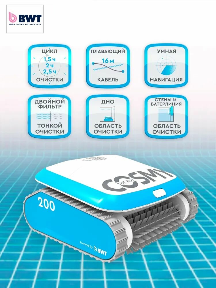 Автоматический подводный робот-пылесос для бассейна BWT COSMY 200 - это идеальный вариант для очистки частных бассейнов любых форм и поверхностей, длиной до 10 м.