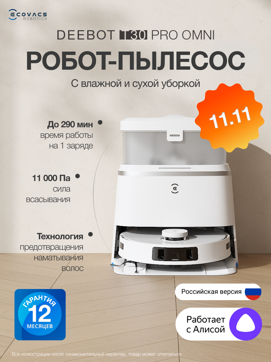 Робот-пылесос ECOVACS DEEBOT T30 PRO OMNI — это инновационное устройство, сочетающее в себе функции сухой и влажной уборки для обеспечения безупречной чистоты вашего дома.