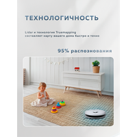 | Особенности конструкции | акселерометр, гироскоп, датчик TOF, датчик перепада высоты, индикатор заполнения пылесборника, лидар, мусоросборник в базе, мягкий бампер |