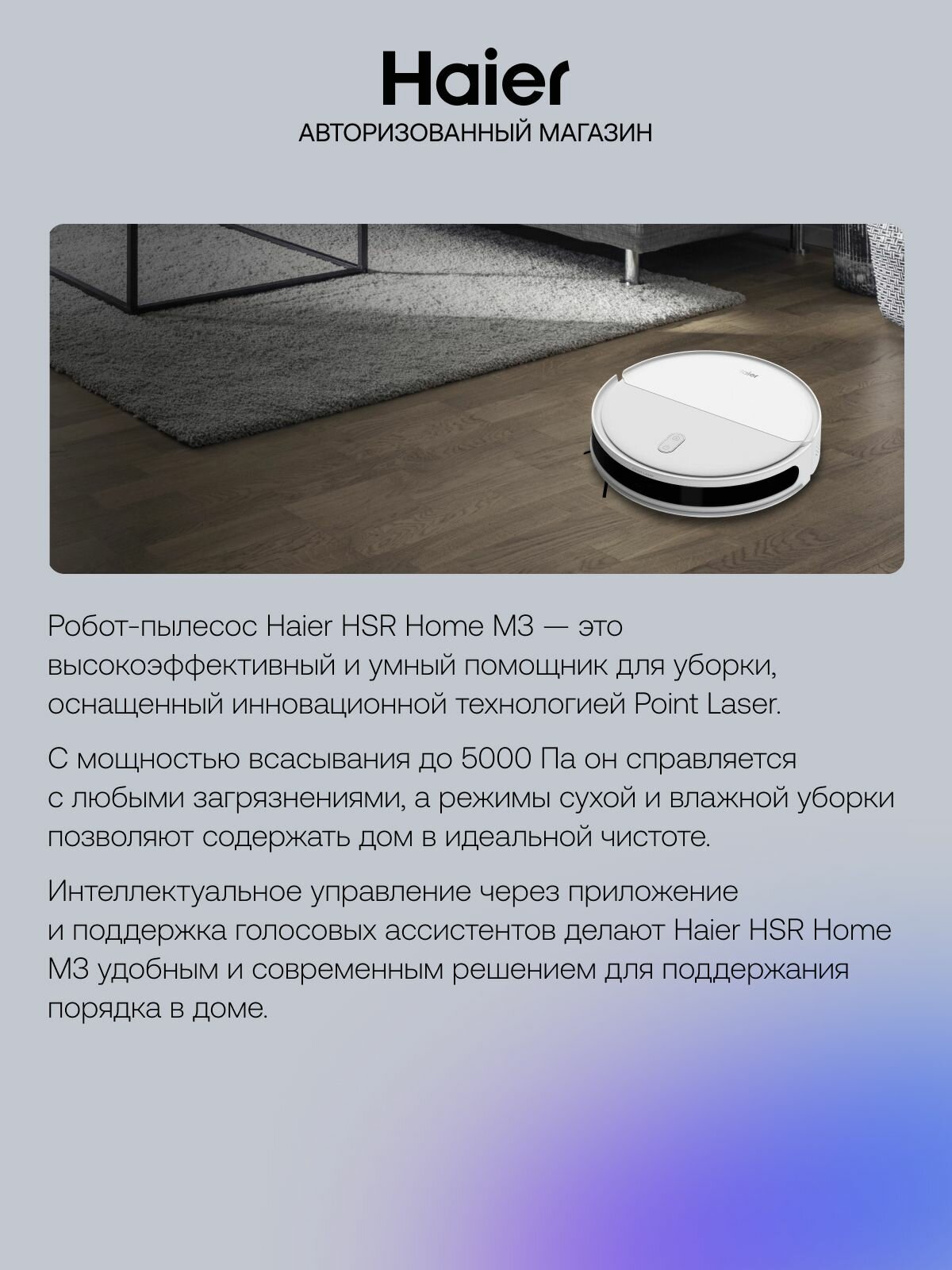 Выбирая робот-пылесос Haier HSR Home M3, вы получаете надежного помощника для уборки вашего дома, который сочетает в себе высокую эффективность, стильный дизайн и простоту использования.