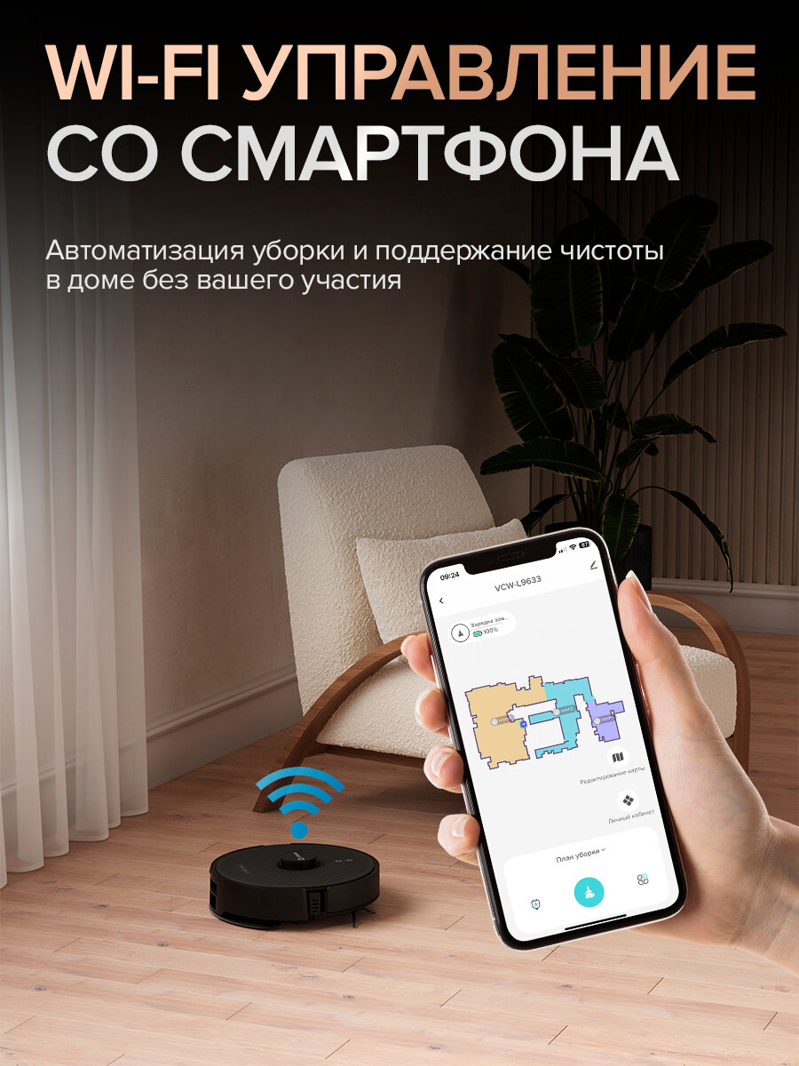 Libhof VCW-L9633 black — это умный робот пылесос для уборки, который обеспечивает эффективное очищение на разных типах покрытий. Робот-пылесос с лидаром обеспечивает точное и безопасное ориентирование в помещении. Интеллектуальная технология планирования маршрутов подбирает оптимальный путь для быстрой и тщательной уборки, автоматически обходя препятствия и переключаясь между зонами с разной степенью загрязнения. Благодаря мощности всасывания 8000 Па и функции распознавания ковров, устройство автоматически адаптирует мощность для эффективной очистки любых поверхностей — от ламината и паркета до плитки и ковровых покрытий, успешно справляясь с пылью, шерстью и пятнами. Датчики высоты позволяют беспрепятственно переходить через пороги до 20 мм. Емкость аккумулятора обеспечивает продолжительную работу до 160 минут на одной зарядке, а вместительные контейнер для пыли (250 мл) и резервуар для воды (300 мл) позволяют проводить продолжительные уборки без частых подзарядок. Робот пылесос для сухой и влажной уборки оснащен управлением через приложение и голосовые команды, что делает использование простым и удобным: можно планировать расписание, запускать уборку голосом и контролировать статус уборки удаленно.