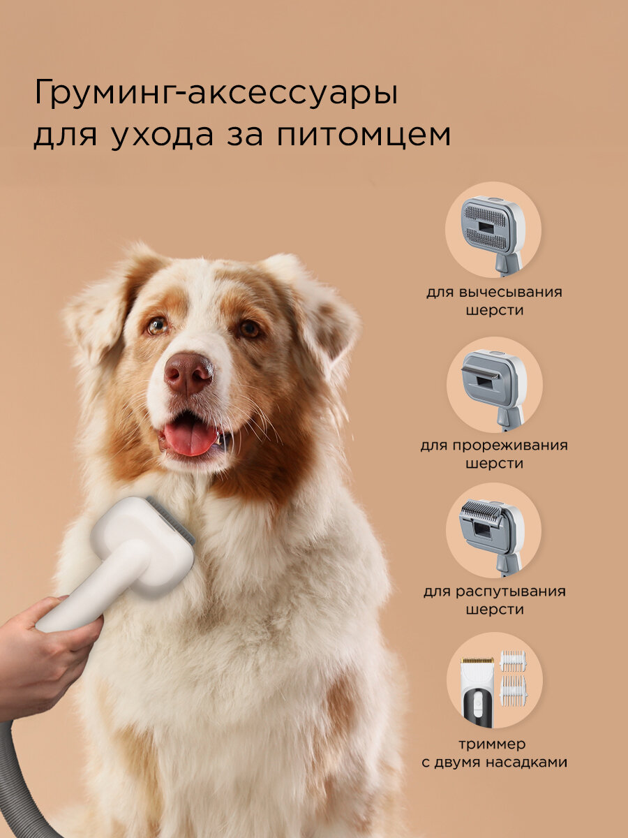 Пылесос подходит для ухода за животными. В комплекте есть триммер с двумя насадками, он позволит регулировать длину стрижки. А насадки-щетки для вычесывания, распутывания и прореживания шерсти ускорят линьку питомца и помогут избежать появления колтунов.