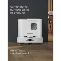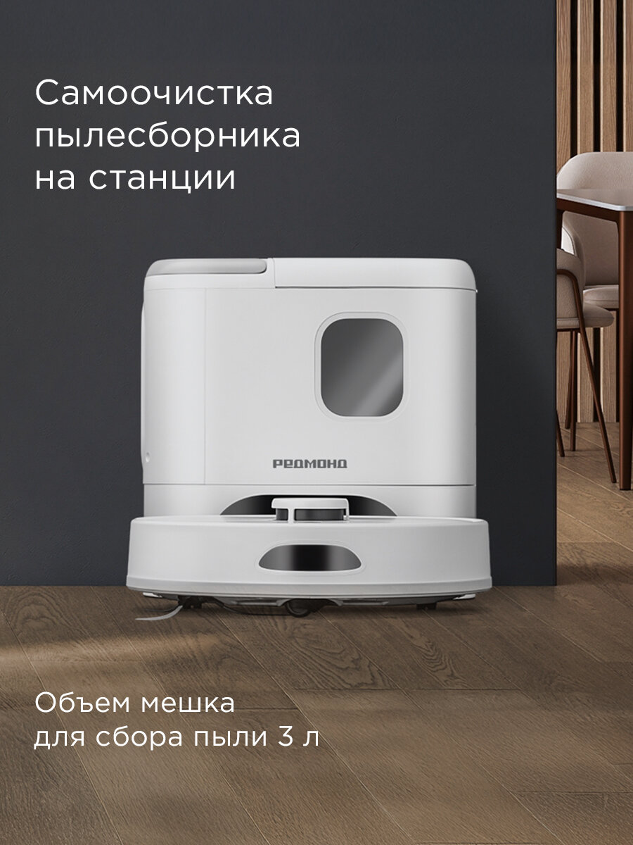 VR1328S самостоятельно возвращается на станцию и опустошает пылесборник (250 мл) комбинированного контейнера. Объем мешка для сбора пыли внутри станции составляет 3 л, поэтому его хватит для уборки всей квартиры в течение двух месяцев. Вы можете самостоятельно регулировать частоту сброса пыли в приложении РЕДМОНД Home.