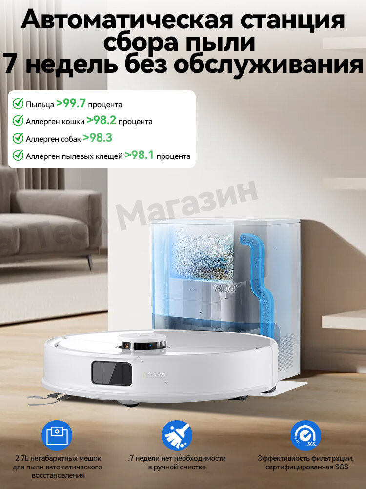| Особенности конструкции | акселерометр, встроенные часы, гироскоп, датчик TOF, датчик перепада высоты, индикатор заполнения пылесборника, лидар, мусоросборник в базе, мягкий бампер, подсветка дисплея |