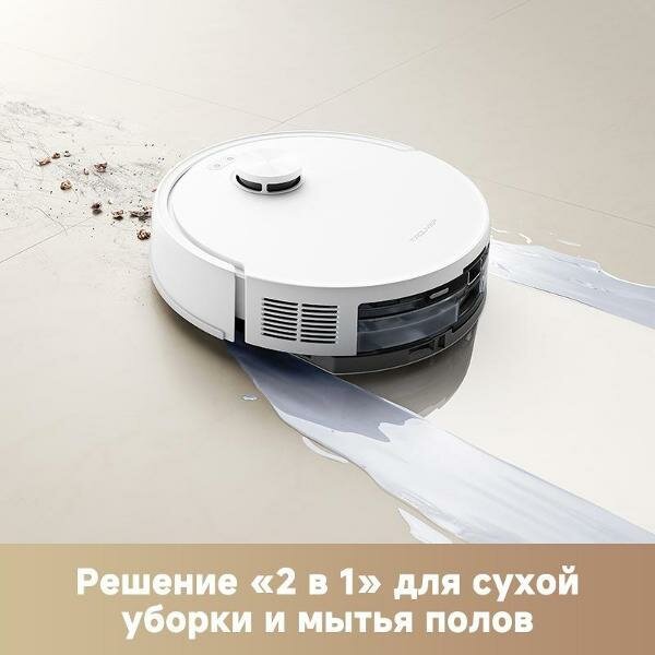 Робот-пылесос Trouver E20s Pro, оснащенный интеллектуальной системой навигации, управляется через мобильное приложение и может работать по расписанию. • Мощность всасывания 13000 Па Обеспечивает сбор пыли, мусора и шерсти с различных типов поверхностей, включая ковры высотой до 2 см. • Многосенсорная система навигации Использование лидара, гироскопа, инфракрасных и сенсорных датчиков помогает точно планировать маршрут движения. • Комбинированный режим Встроенный резервуар объемом 0,245 л и съемная салфетка дают возможность совместить сухую и влажную уборку. • Интеграция с системой умного дома Устройство совместимо с экосистемой Яндекс и распознает голосовые команды. • Автоматическое составление карты и зонирование Робот создает план помещения, что позволяет задавать виртуальные ограничительные зоны и выбирать конкретные комнаты для уборки через приложение. Пылесос дополнен HEPA-фильтром для тонкой очистки воздуха. Объем пылесборника составляет 0,3 л. Литий-ионного аккумулятора емкостью 3200 мА*ч хватает на уборку площади до 120 м². Уровень шума не превышает 82 дБ. Корпус размером 44,2х37,2х13,3 см и весом 3,02 кг сделан из пластика белого цвета.
