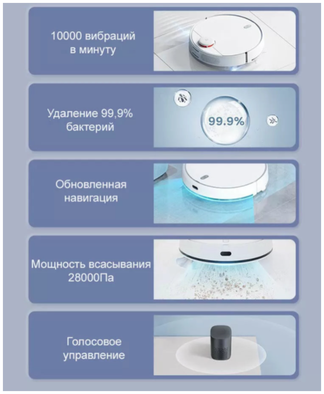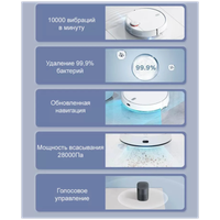 | Особенности конструкции | гироскоп, датчик TOF, датчик перепада высоты, индикатор заполнения пылесборника, лидар, мусоросборник в базе, мягкий бампер |