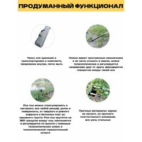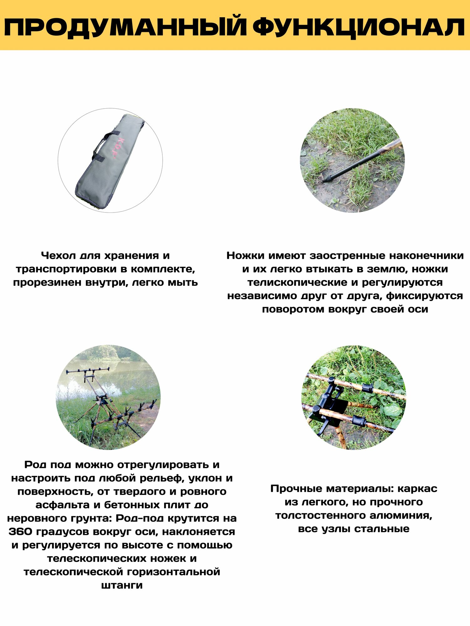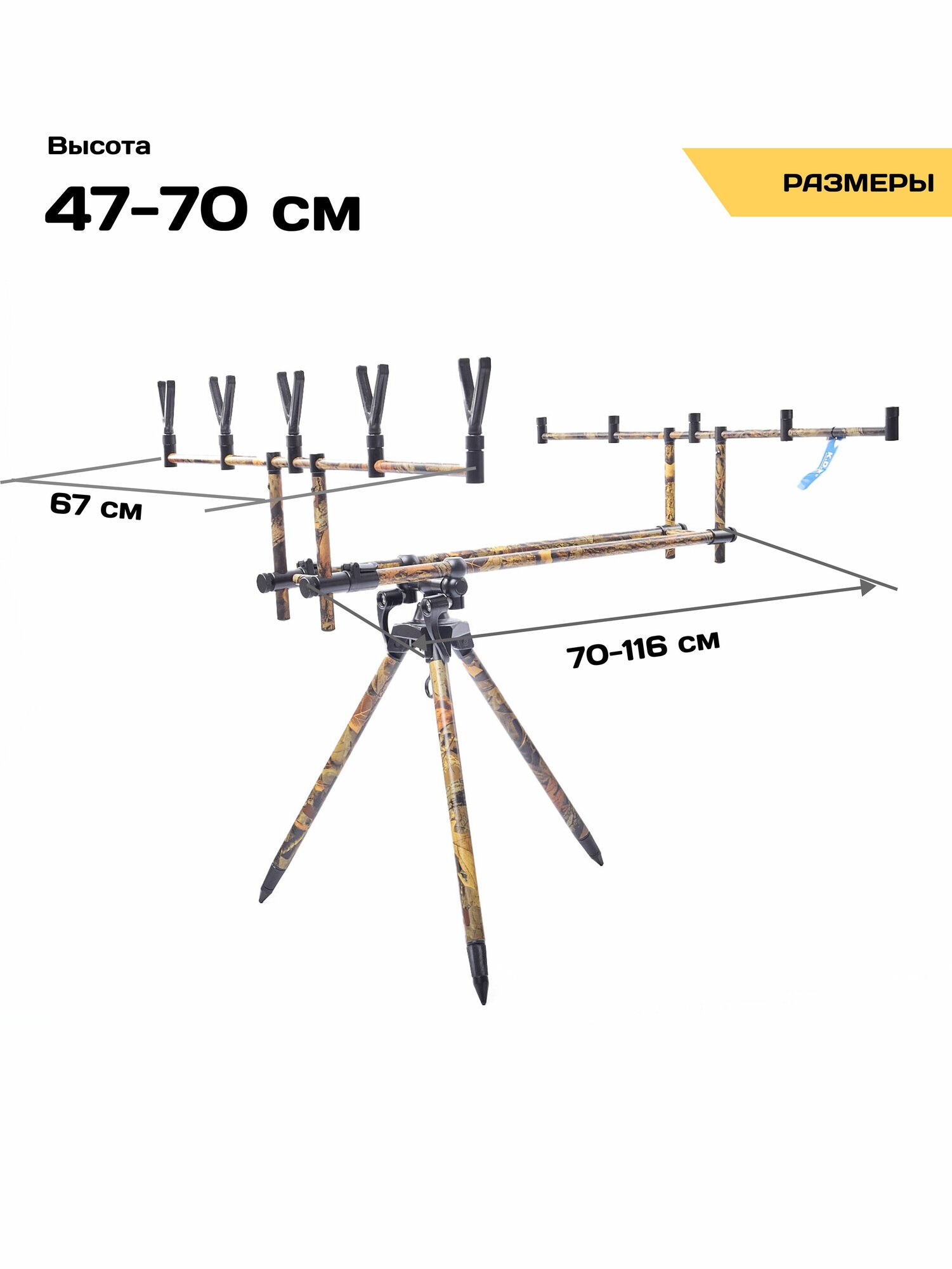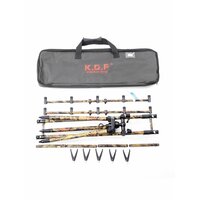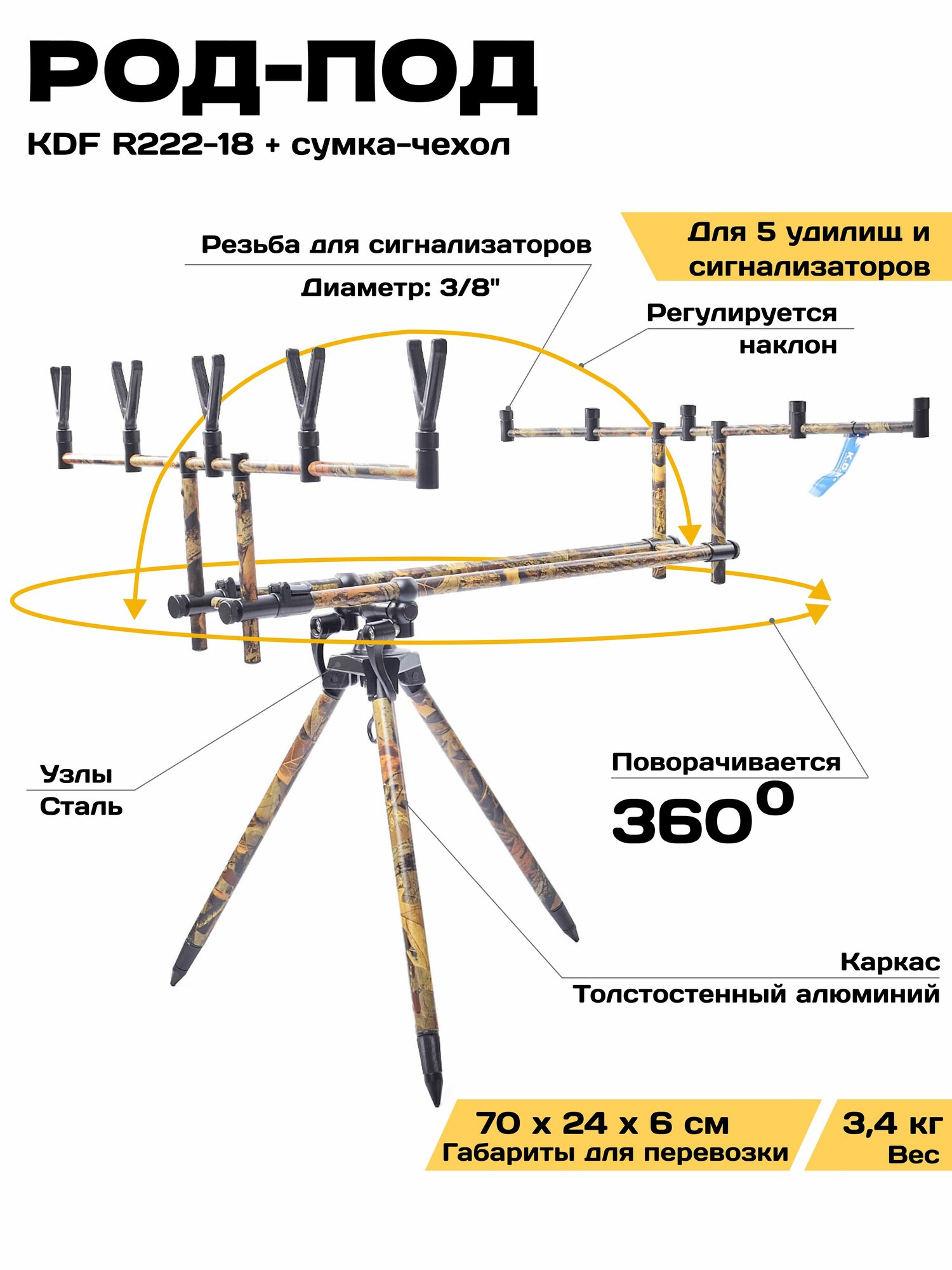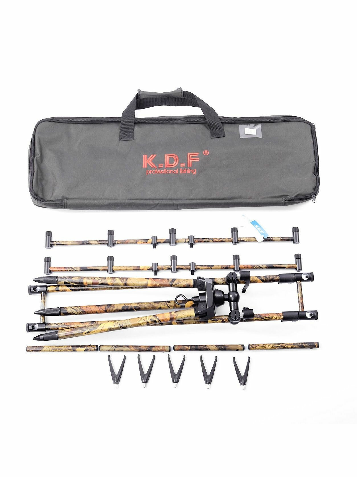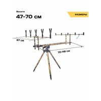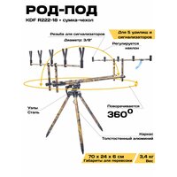 Это топовая модель род-пода от компании K.D.F В этом род-плед идеально все! А именно: 1. Толстостенный алюминий, качество на высоте. 2. Идеально подогнанные детали и как следствие отсутствие люфтов. 3. Премиальная раскраска, которая сливается с окружающей средой! 4. Поворот на 360 градусов и высокий угол наклона! 5. Доработанная модель род-пода 2024 года, который стал хитом продаж и имеет высокие отзывы самых требовательных рыболовов экспертов. 6. Все узлы и агрегаты Род Пода сделаны из металла Род-под упакован в удобную сумку-чехол для переноски, с прорезиненными внутренними стенками. Сумка имеет рукоятки с двух сторон, которые оснащены муфтой на липучке. Это довольно удобно, так как при переноски ручки не врезаются в руку и они не скатываются. Так же на сумке имеется молния с двумя замками. Внутри чехла есть несколько отделений-секций, где находится в закрепленном состоянии непосредственно сам род-под и необходимые элементы для его сборки. Телескопические ножки род-пода фиксируются вращением внутри своей оси и выдвигаются на любую необходимую длину. Ножки сделаны из прочного, толстостенного алюминия. Конусовидное окончание ножек позволяет втыкать их в землю без лишних усилий. Центральная конструкция род-пода имеет передвижную, телескопическую, трубчатую конструкцию. Крепление центральной конструкции происходит за счет отдельных винтовых рукояток. Две поперечные стойки фиксируются с помощью вращения на винтовой резьбе. Род-под имеет камуфляжную окраску, современный объёмный 3D принт, камуфляж, под листья и прочую окружающую обстановку и не выделяется на фоне травы. Сборка данного род-пода не занимает много времени. Конструкция довольно простая но надежная. Конструкция не имеет люфтов. В центральном стальном конусе, который соединяет центральную конструкцию и телескопические ножки имеется резьба, по бокам , для ножек и центральная резьба для соединения с центральной конструкцией с помощью винтовой рукоятки. Род-под рассчитан на 5 удилищ и легко меняет угол наклона, а так же поворачивается вокруг своей оси на 360 градусов. Регулировка имеется и на штанге центральной конструкции, на необходимую длину. В комлевой части род-пода вкручиваются рагатулины, которые так же идут в комплекте. Род под имеет идеальную подгонку всех деталей, что обеспечивает надежную конструкцию. Род под можно оснастить сигнализаторами поклевок, которые так же можно приобрести в нашем магазине!