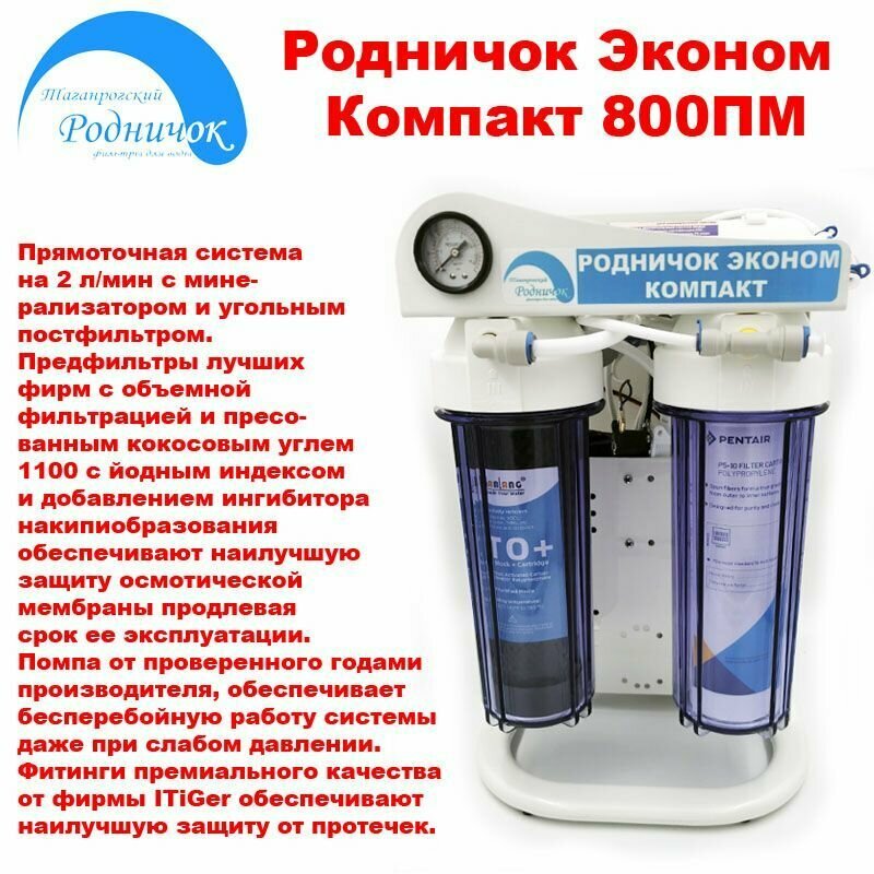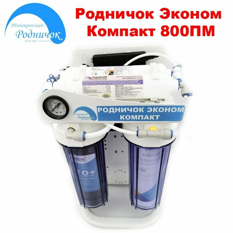 - экономичность — эффективная система предочистки с использованием предфильтров Родничок СТО+ на основе высококачественных механических фильтров от фирмы Pentair с объемной фильтрацией в сочетании с прессованным кокосовым углем имеющим йодный индекс 1100 с добавлением я кристаллического фосфата (Crystphos) и шаров Maifan Mineral (для предотвращения агломерации фосфатов). Эта предочистка гарантировано продлевают срок службы мембраны. А так же установлен угольный постфильтр и минерализатор Родничок, позволяющий получать вкусную и полезную воду без обогащенную оинами магния и кальция (состоит из природного материала высокой степени очистки);