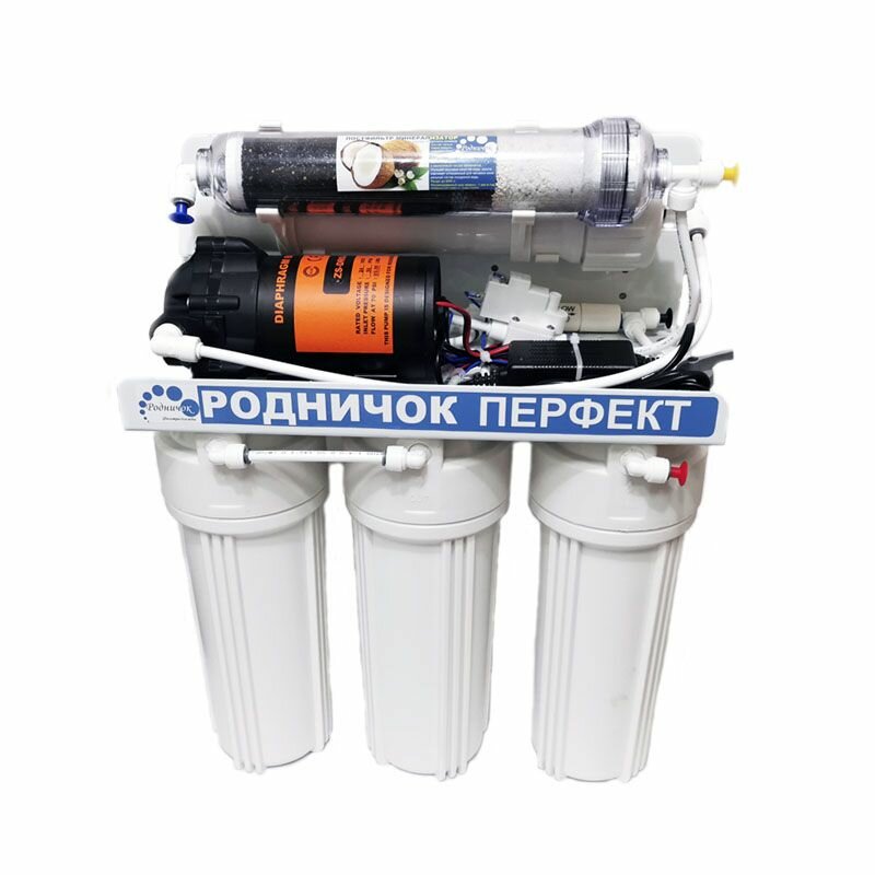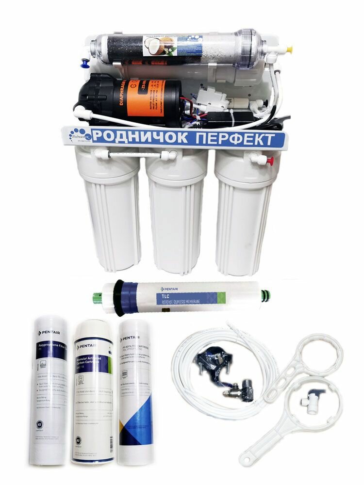 - экономичность — эффективная система предочистки с использованием предфильтров Pentair (США), продлевающая срок службы мембраны, а так же использован совмещенный постфильтр-минерализатор Родничок, позволяющий получать вкусную и полезную воду без необходимости приобретать минерализатор отдельно;