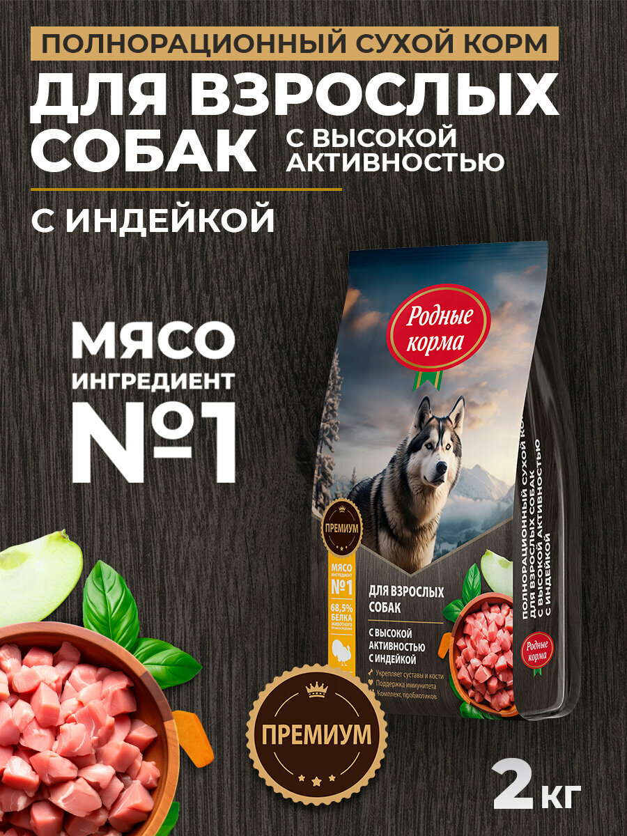 Родные корма 2 кг полнорационный сухой корм для взрослых собак с высокой активностью с индейкой: сравнение цен, характеристики, фото, актуальное наличие и цены.