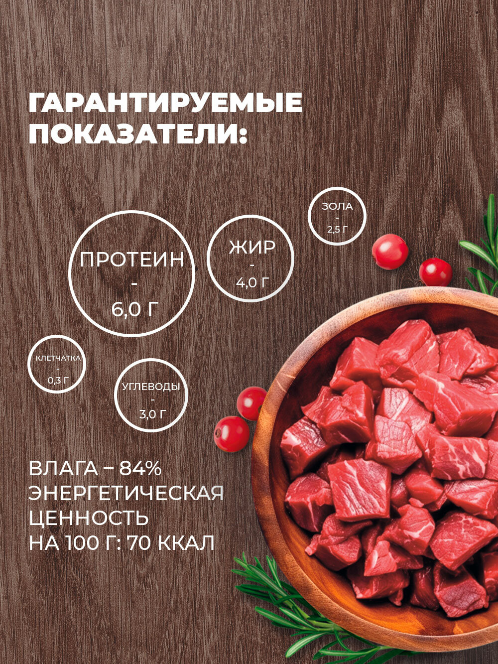 | Пищевая ценность | сырой протеин, не менее 10,0 г; сырой жир, не более 7,0 г; сырая зола, не более 2,0 г; клетчатка 1,0 г; влага, не более 82,0% |