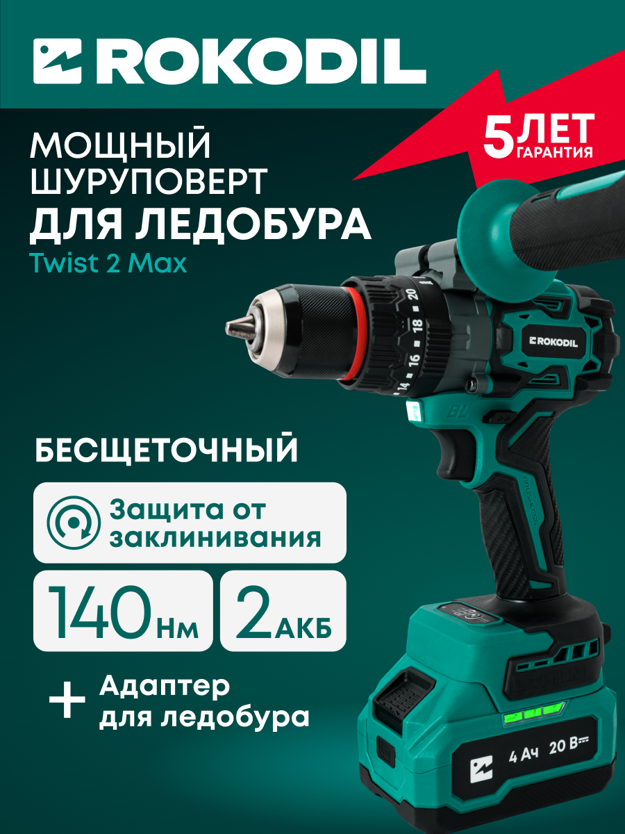 Купить ROKODIL / Мощный бесщеточный аккумуляторный шуруповерт для ледобура / Twist 2 Max / 140Нм, 2 АКБ (4Ач и 2Ач), ударный с доставкой по всей России. ROKODIL / Мощный бесщеточный аккумуляторный шуруповерт для ледобура / Twist 2 Max / 140Нм, 2 АКБ (4Ач и 2Ач), ударный: сравнение цен, характеристики, фото, актуальное наличие и цены.