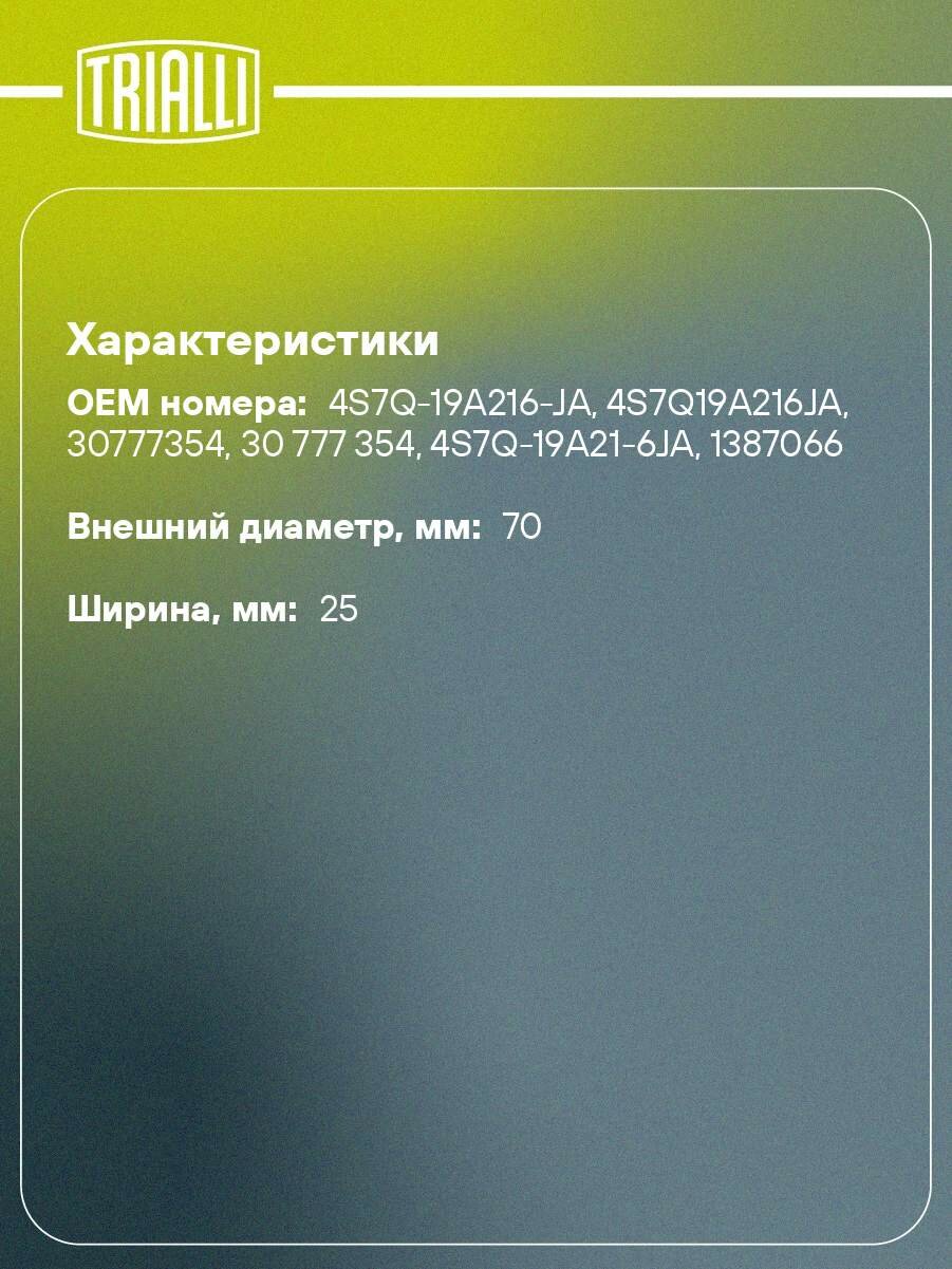Ролик привод. ремня для автомобилей Ford Mondeo III (00-)/Mondeo IV (07-) 1.8i/2.0i/2.0d/2.3i (опорный) d=70 CM 3006 TRIALLI: сравнение цен, характеристики, фото, актуальное наличие и цены.